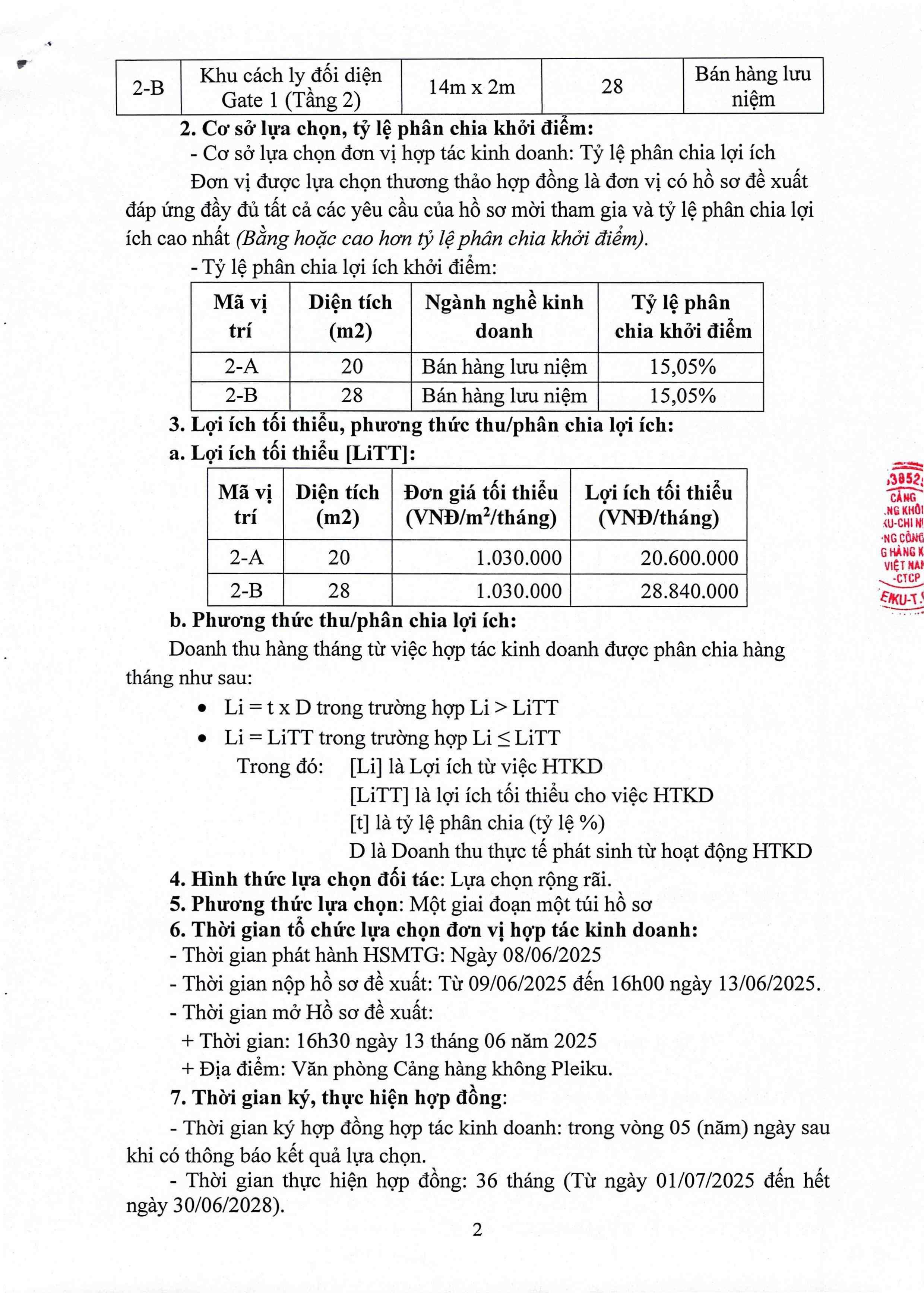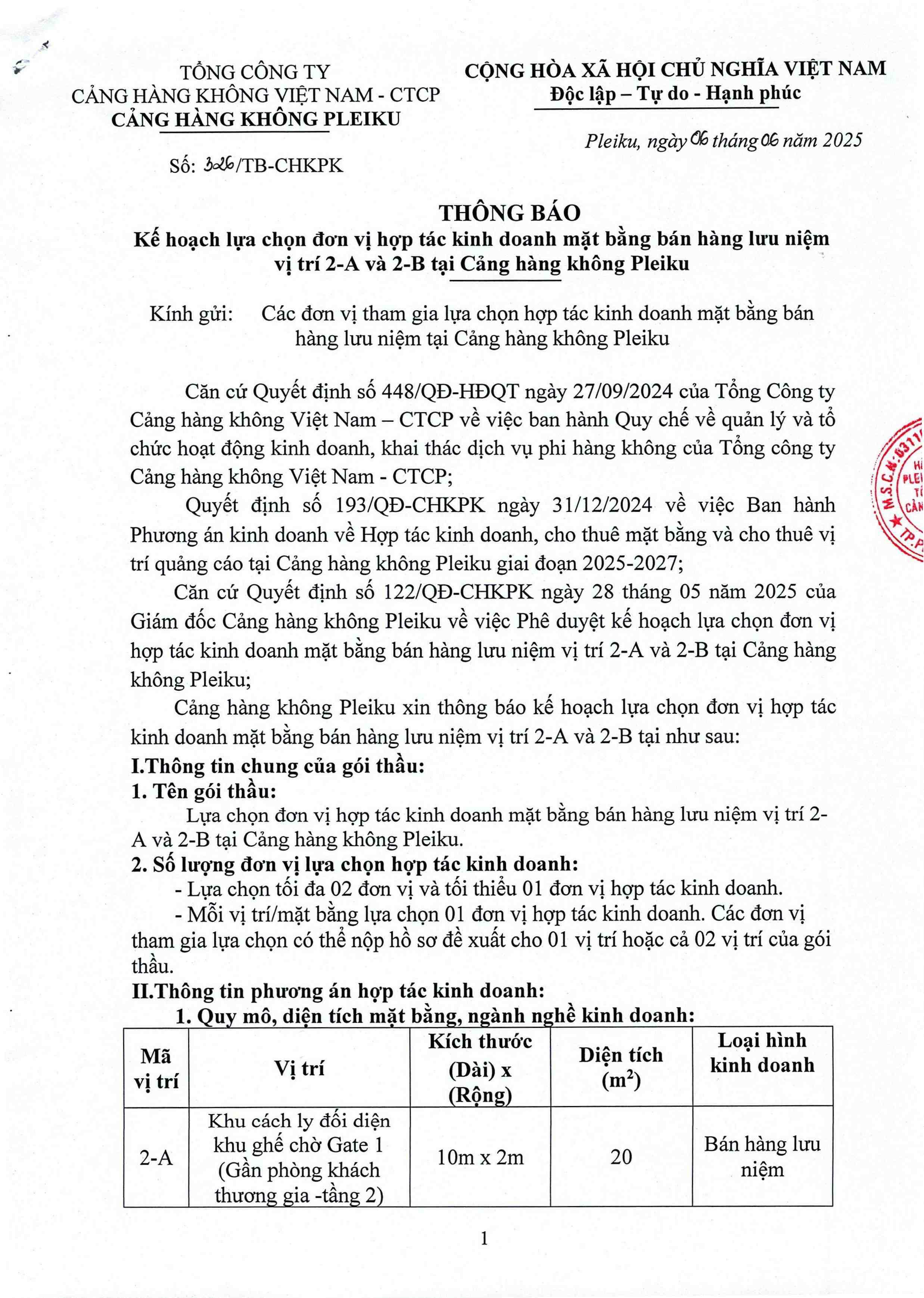 Thông báo kế hoạch lựa chọn đơn vị hợp tác kinh doanh mặt bằng bán hàng lưu niệm vị trí 2A và 2B tại Cảng hàng không Pleiku