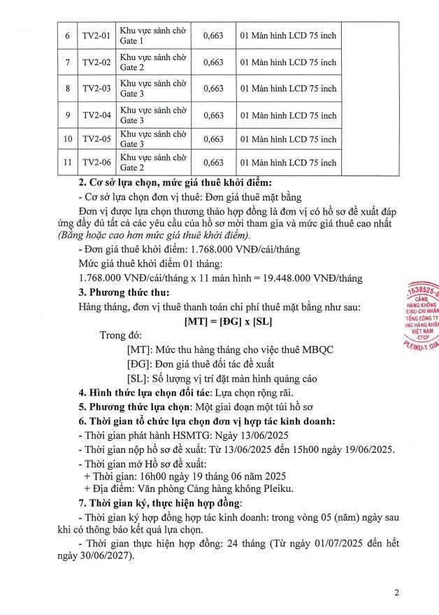 Thông báo kế hoạch lựa chọn đơn vị thuê mặt bằng đặt màn hình LCD quảng cáo tại Cảng hàng không Pleiku