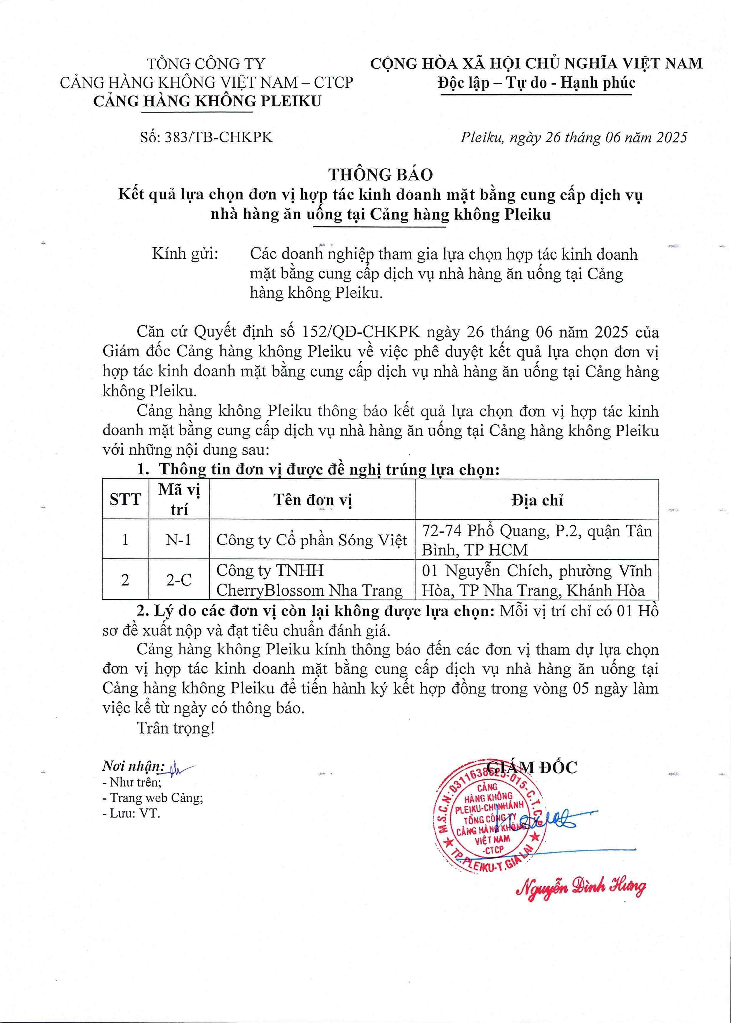 Thông báo kết quả lựa chọn đơn vị hợp tác kinh doanh mặt bằng cung cấp dịch vụ nhà hàng ăn uống tại Cảng hàng không Pleiku