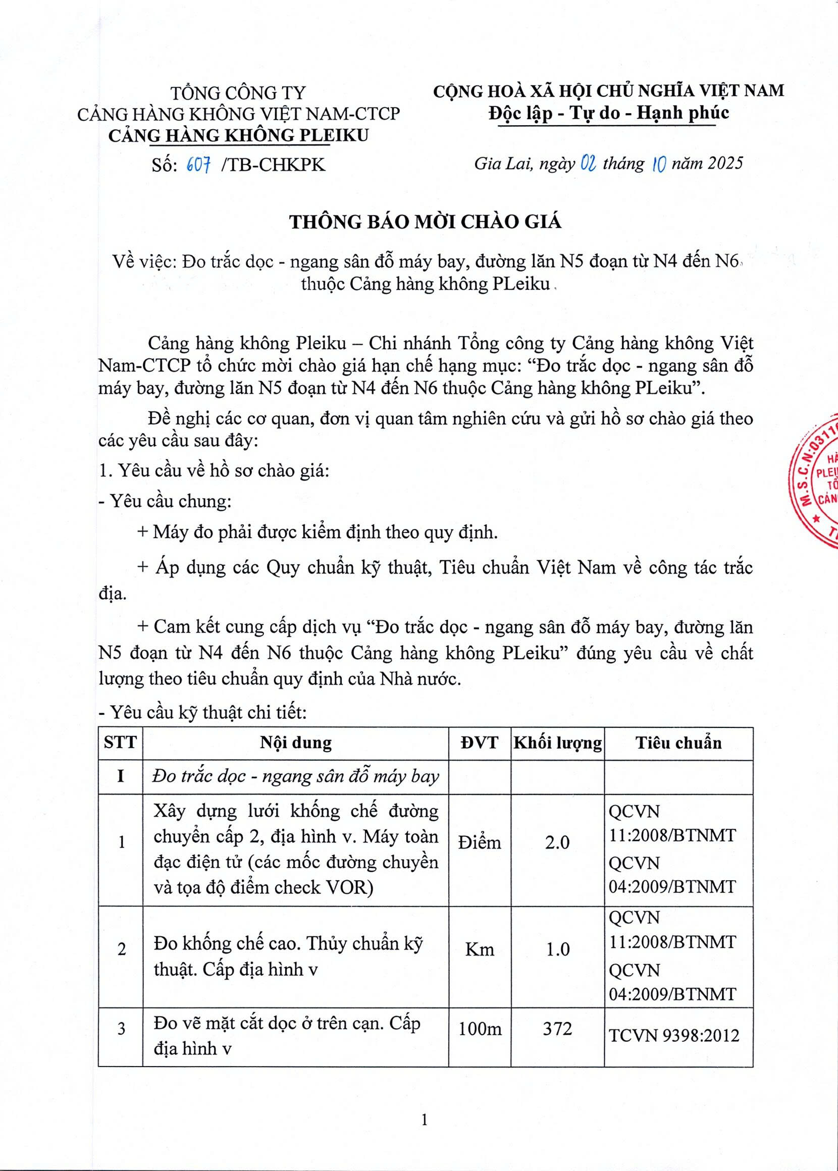 Thông báo mời chào giá: Đo trắc dọc - ngang sân đỗ máy bay, đường lăn N5 đoạn từ N4 đến N6 thuộc Cảng hàng không Pleiku