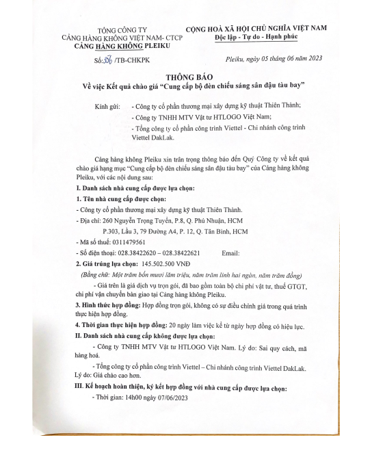 Thông báo về việc Kết quả chào giá “Cung cấp và lắp đặt hệ thống cảnh báo an toàn cho xe thang hành khách tại Cảng hàng không Pleiku”