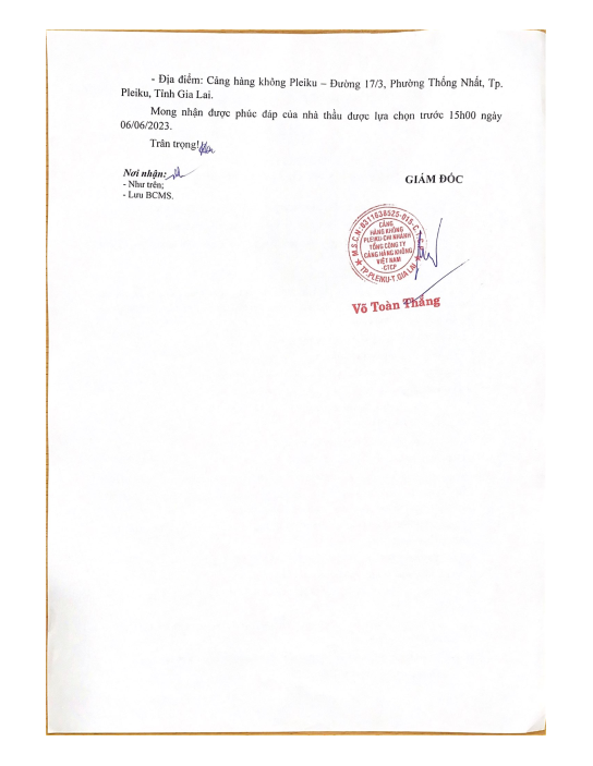 Thông báo về việc Kết quả chào giá “Bảo dưỡng định kỳ hệ thống xử lý nước thải sinh hoạt 06 tháng cuối năm 2025 tại Cảng hàng không Pleiku”