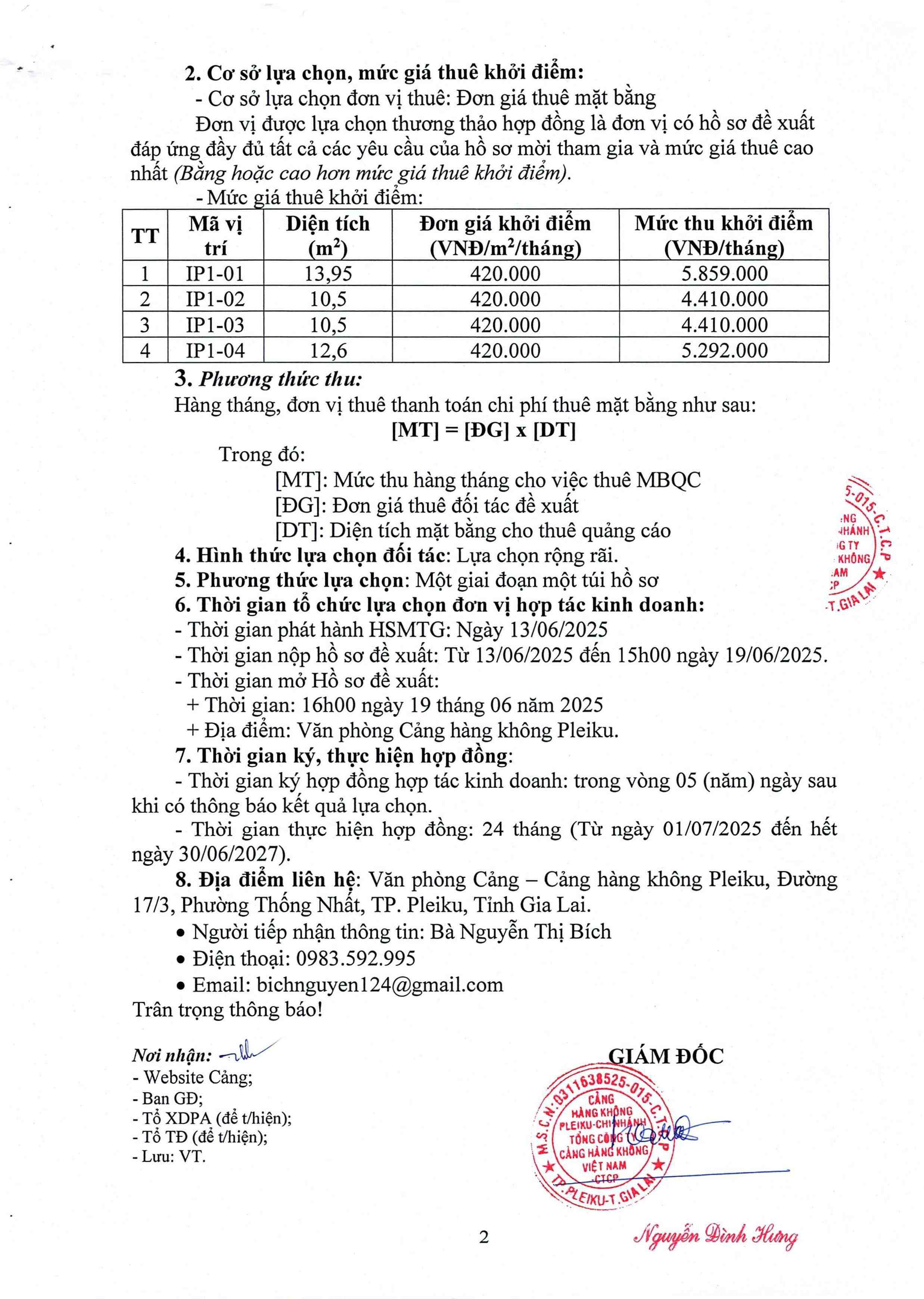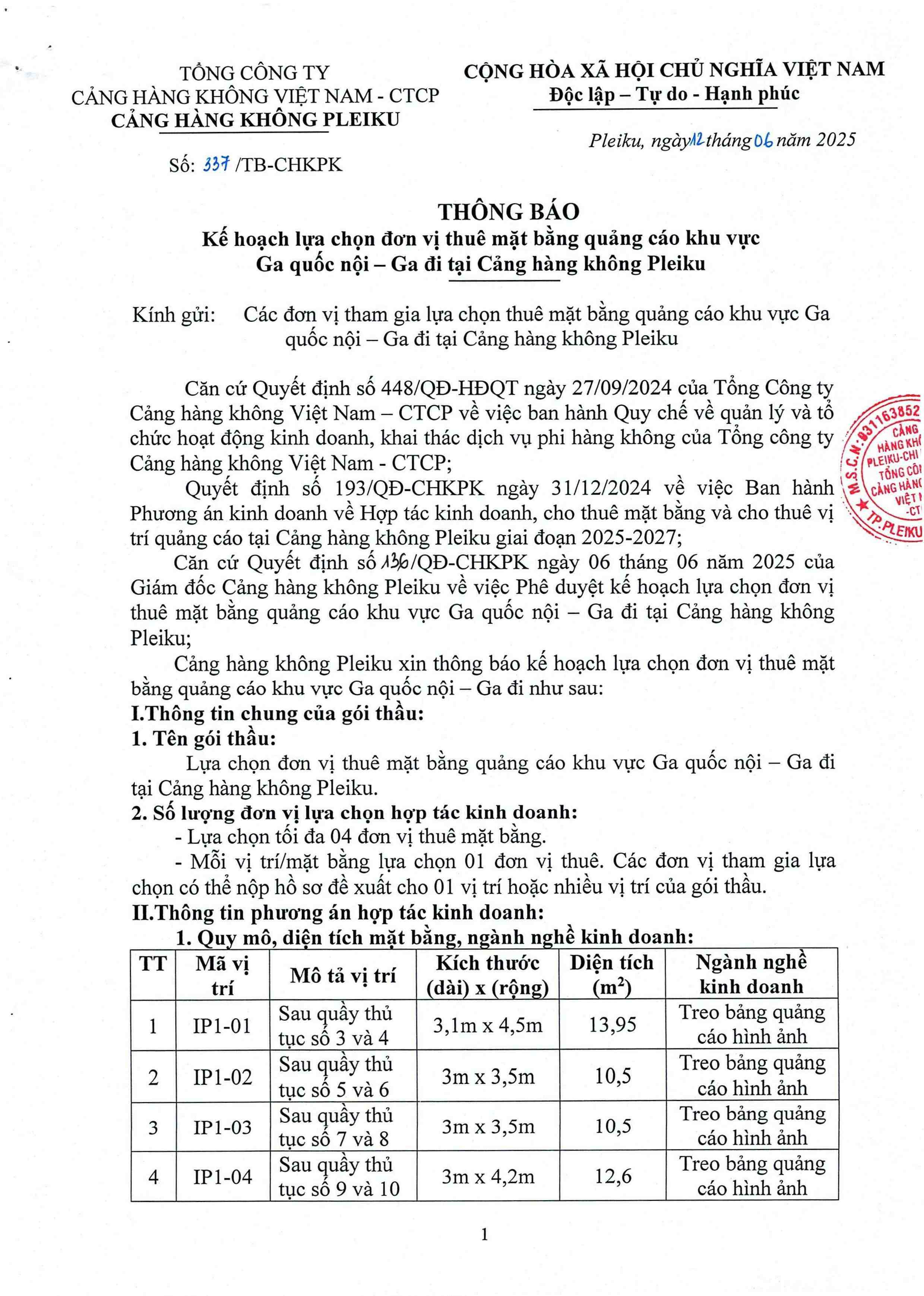Thông báo kế hoạch lựa chọn đơn vị thuê mặt bằng quảng cáo khu vực Ga quốc nội - Ga đi tại Cảng hàng không Pleiku