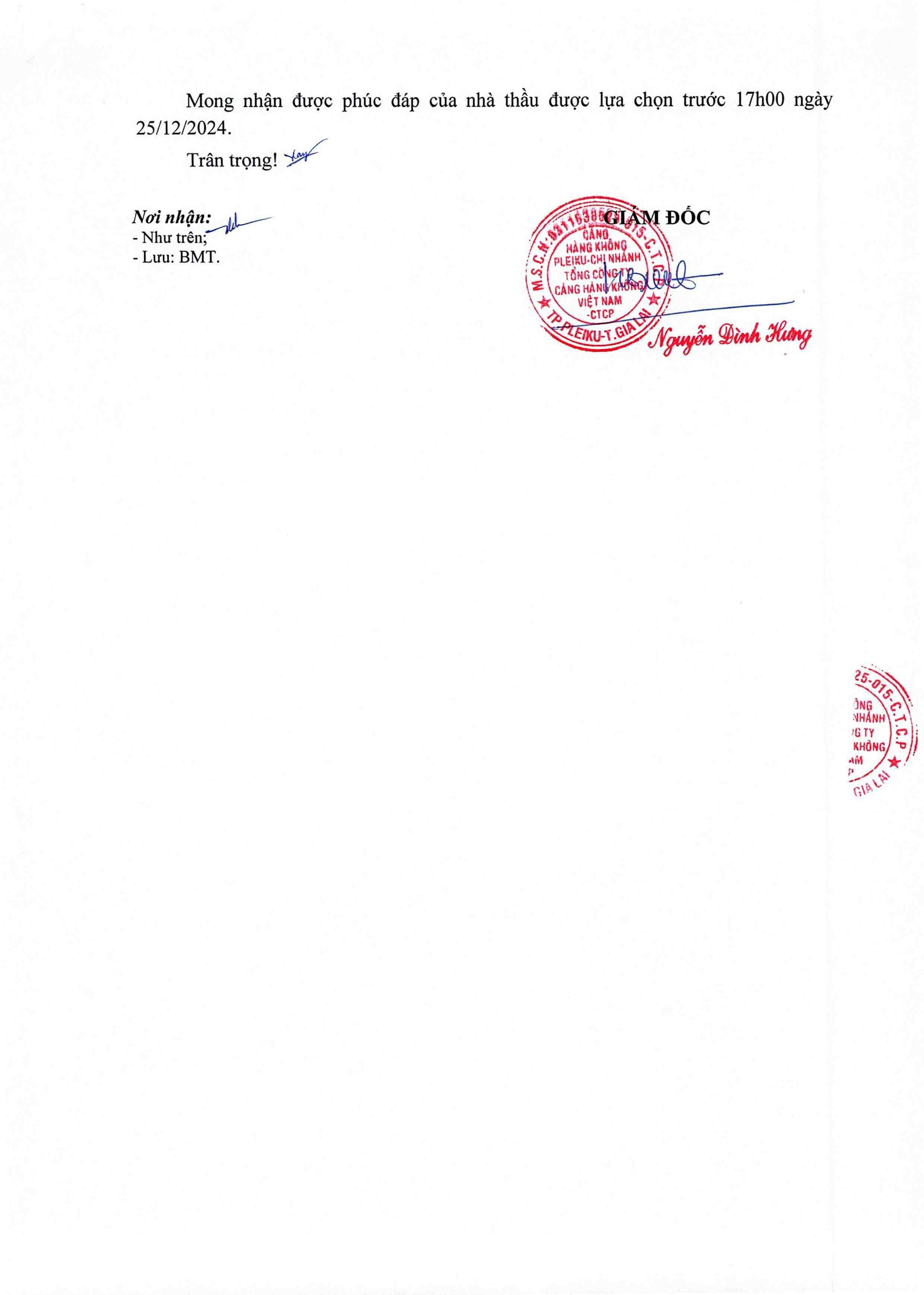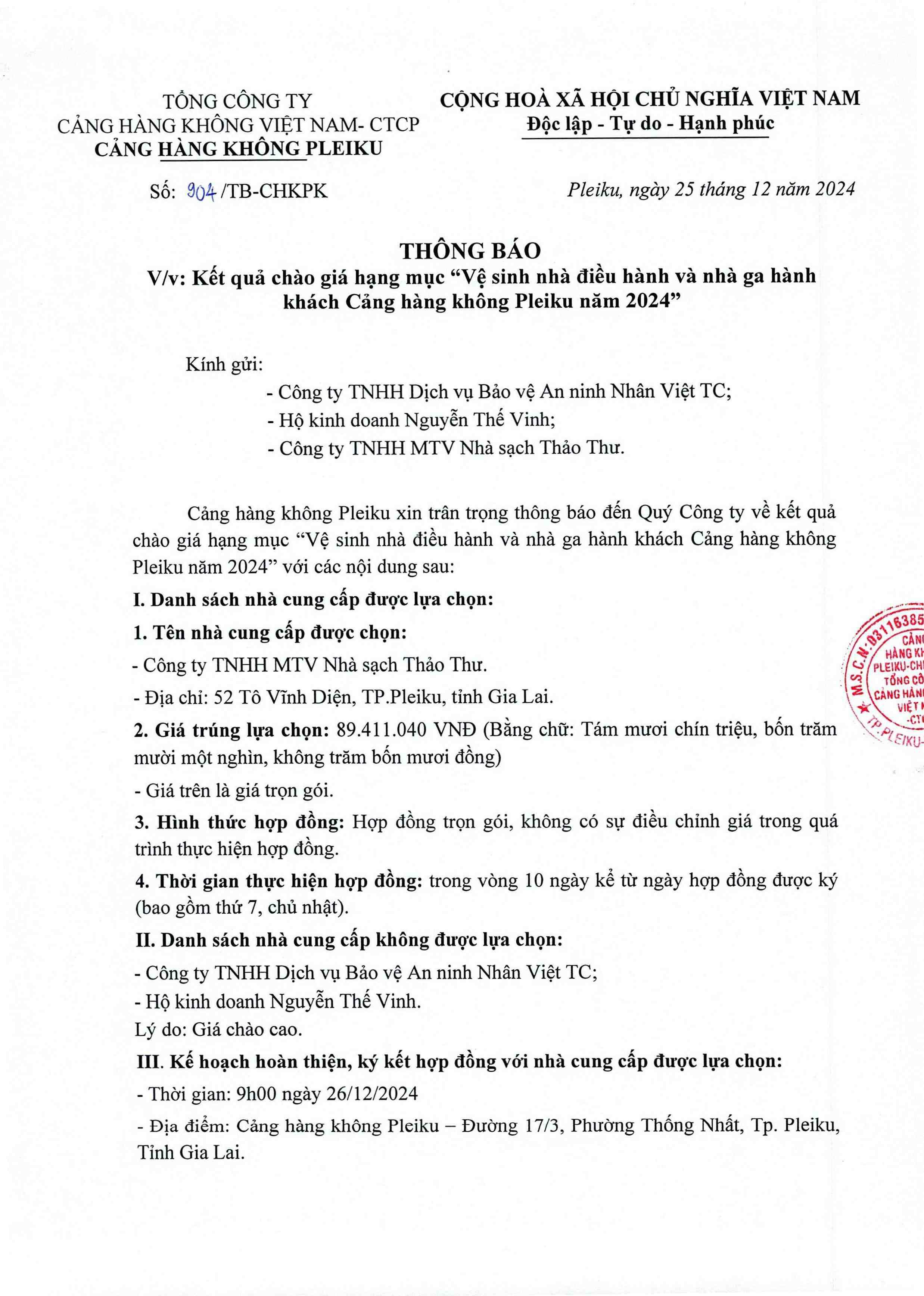 Thông báo về việc Kết quả chào giá “Bảo dưỡng định kỳ hệ thống xử lý nước thải sinh hoạt 06 tháng cuối năm 2025 tại Cảng hàng không Pleiku” (20/11)