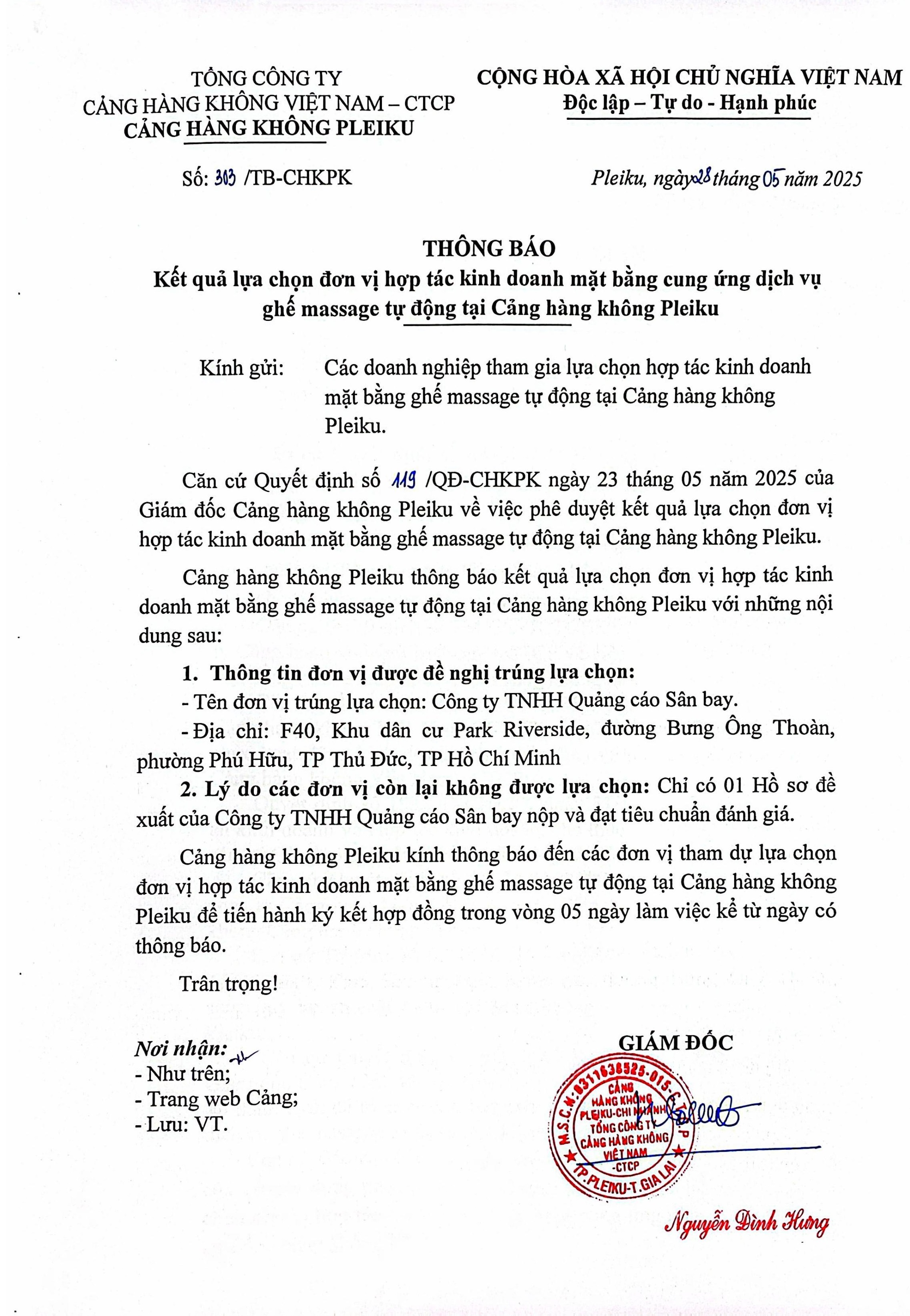 Thông báo kết quả lựa chọn: Đơn vị hợp tác kinh doanh mặt bằng cung ứng dịch vụ ghế massage tự động tại Cảng hàng không Pleiku