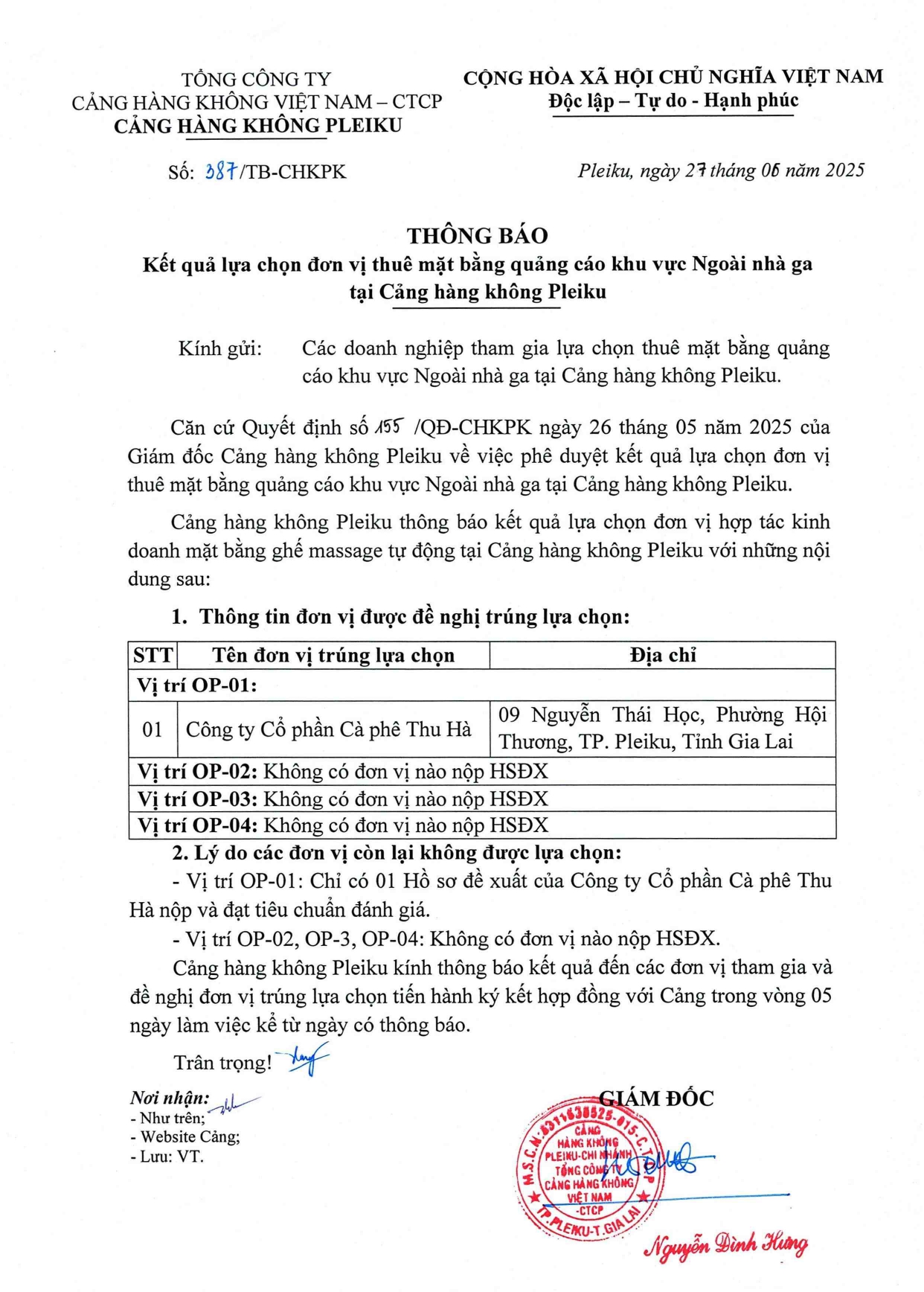 Thông báo kết quả lựa chọn đơn vị thuê mặt bằng quảng cáo khu vực Ngoài nhà ga tại Cảng hàng không Pleiku