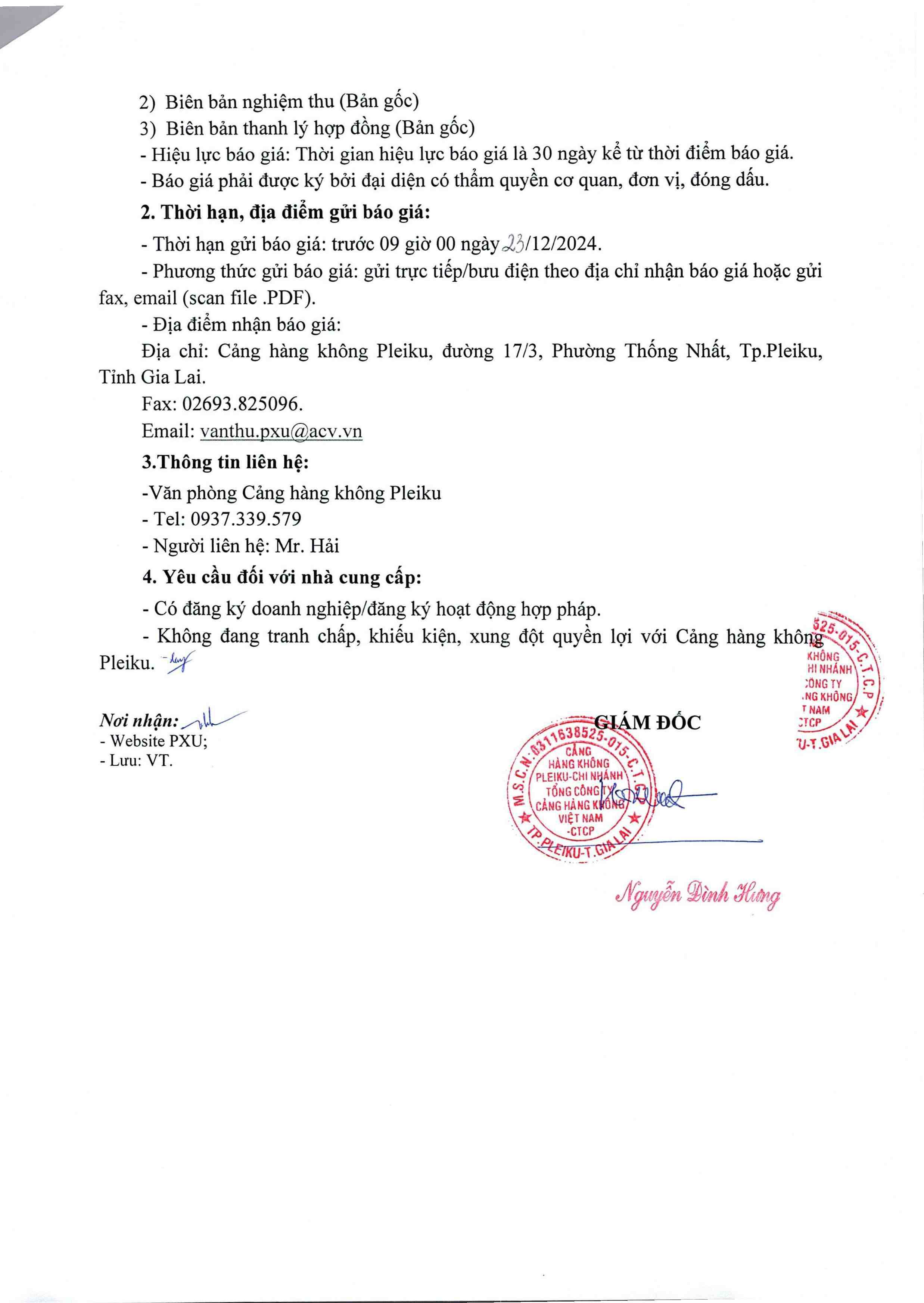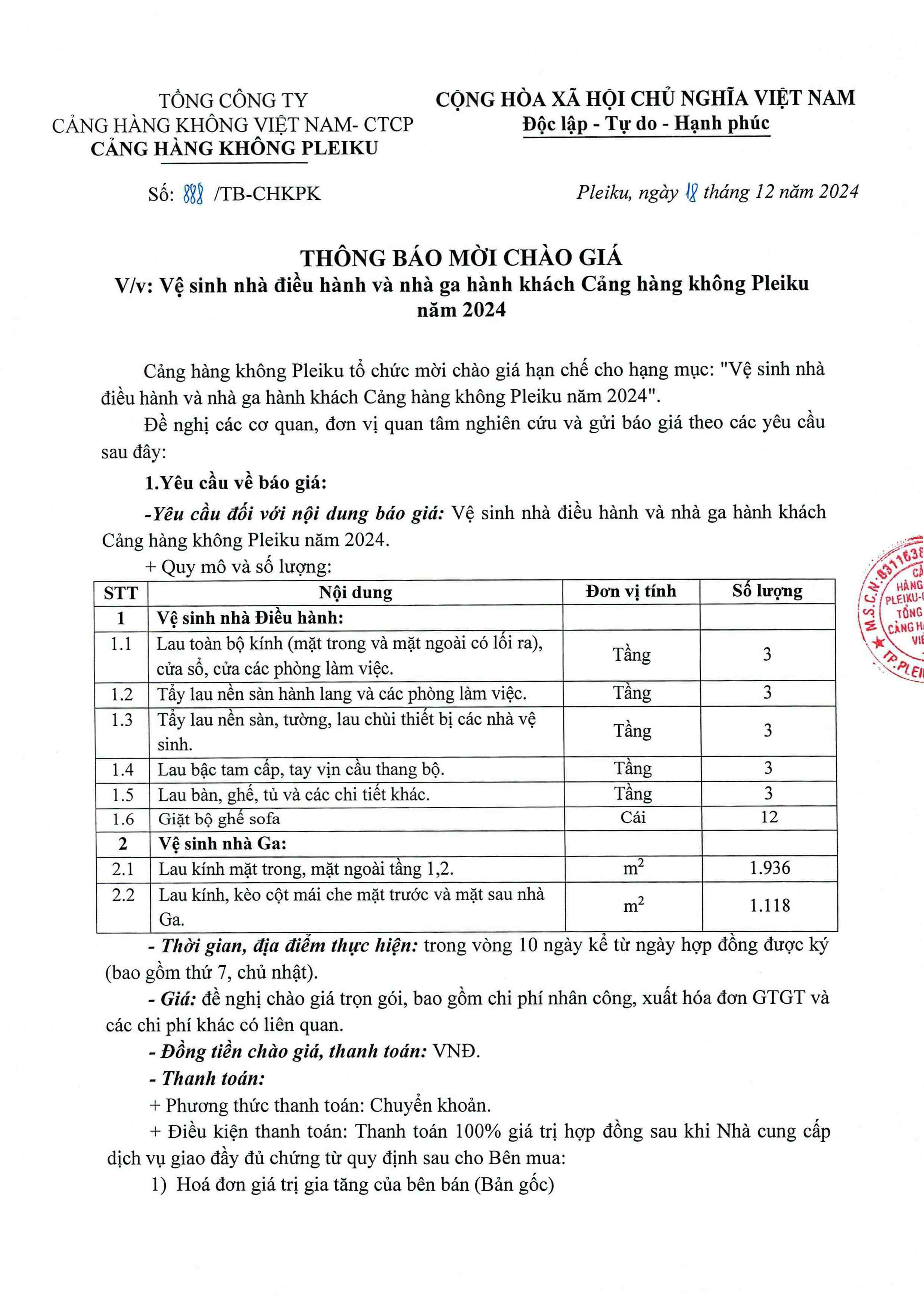 Thông báo mời chào giá: Vệ sinh nhà ga và nhà điều hành Cảng hàng không Pleiku năm 2024