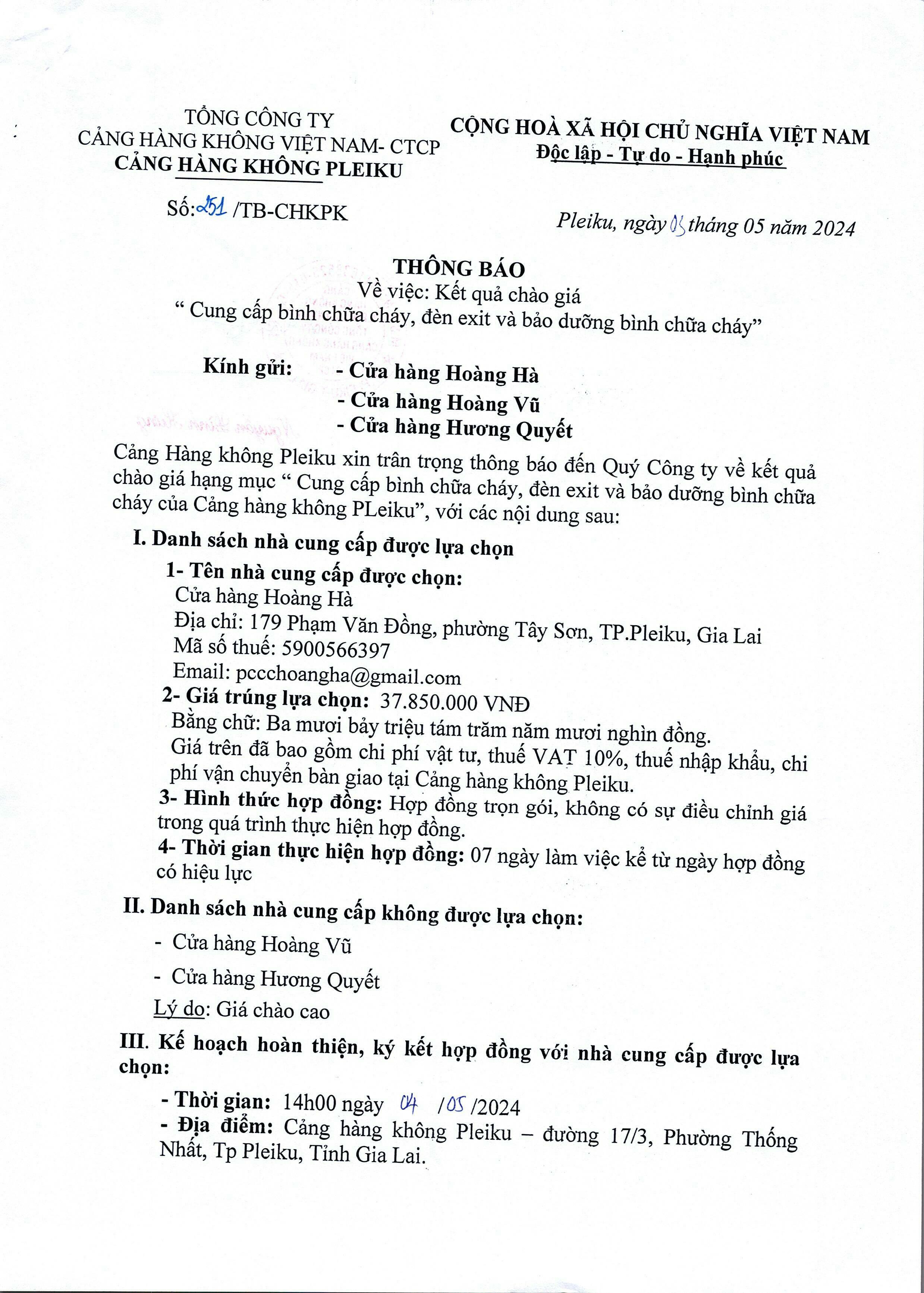 Thông báo về việc Kết quả chào giá “Cung cấp và lắp đặt hệ thống cảnh báo an toàn cho xe thang hành khách tại Cảng hàng không Pleiku”