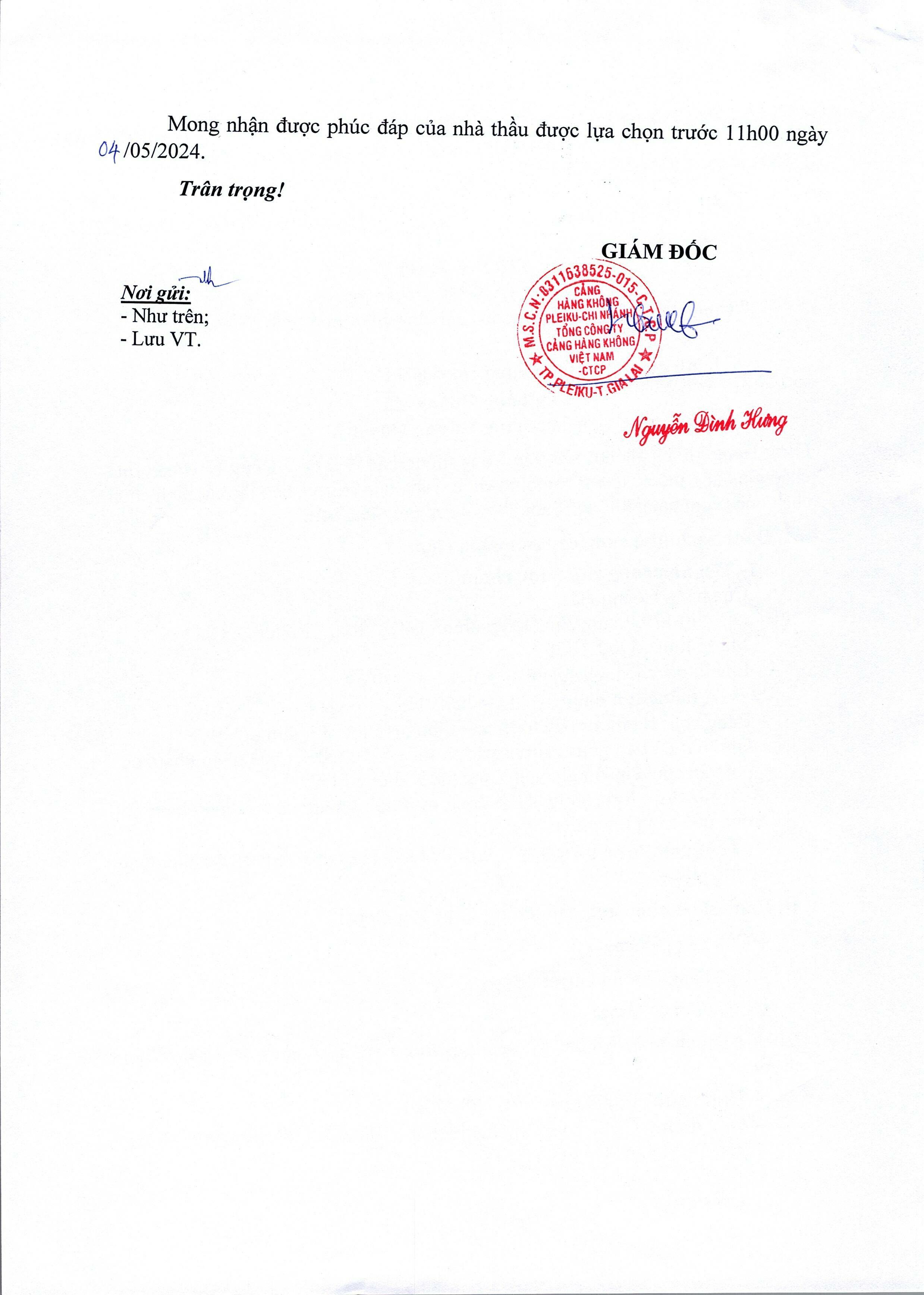 Thông báo mời chào giá về việc "Bảo dưỡng định kỳ hệ thống xử lý nước thải sinh hoạt 06 tháng cuối năm 2025 tại Cảng hàng không Pleiku"