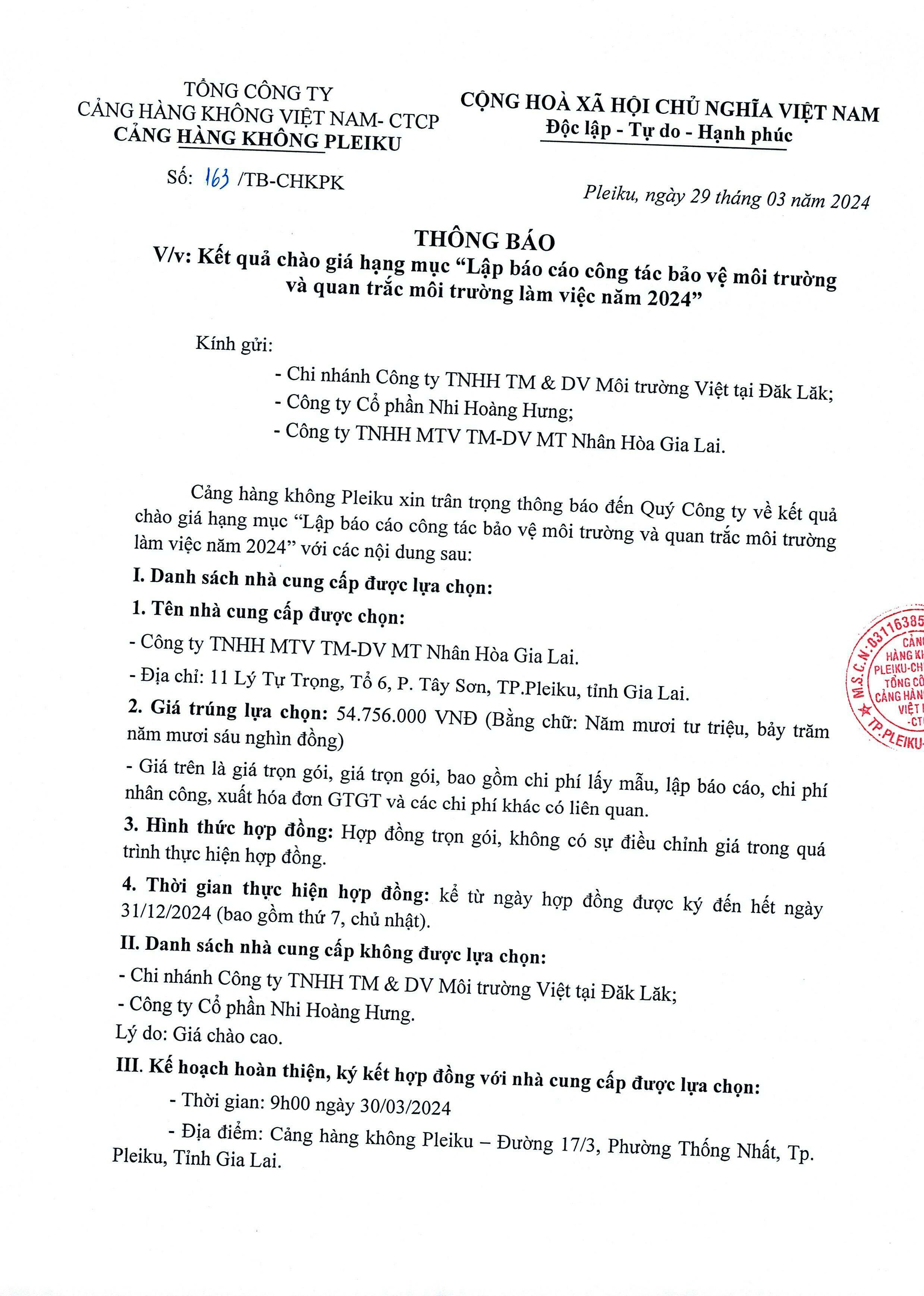 Thông báo kết quả mời chào giá: Lập quan trắc bảo vệ môi trường và quan trắc môi trường lao động Cảng hàng không Pleiku năm 2024