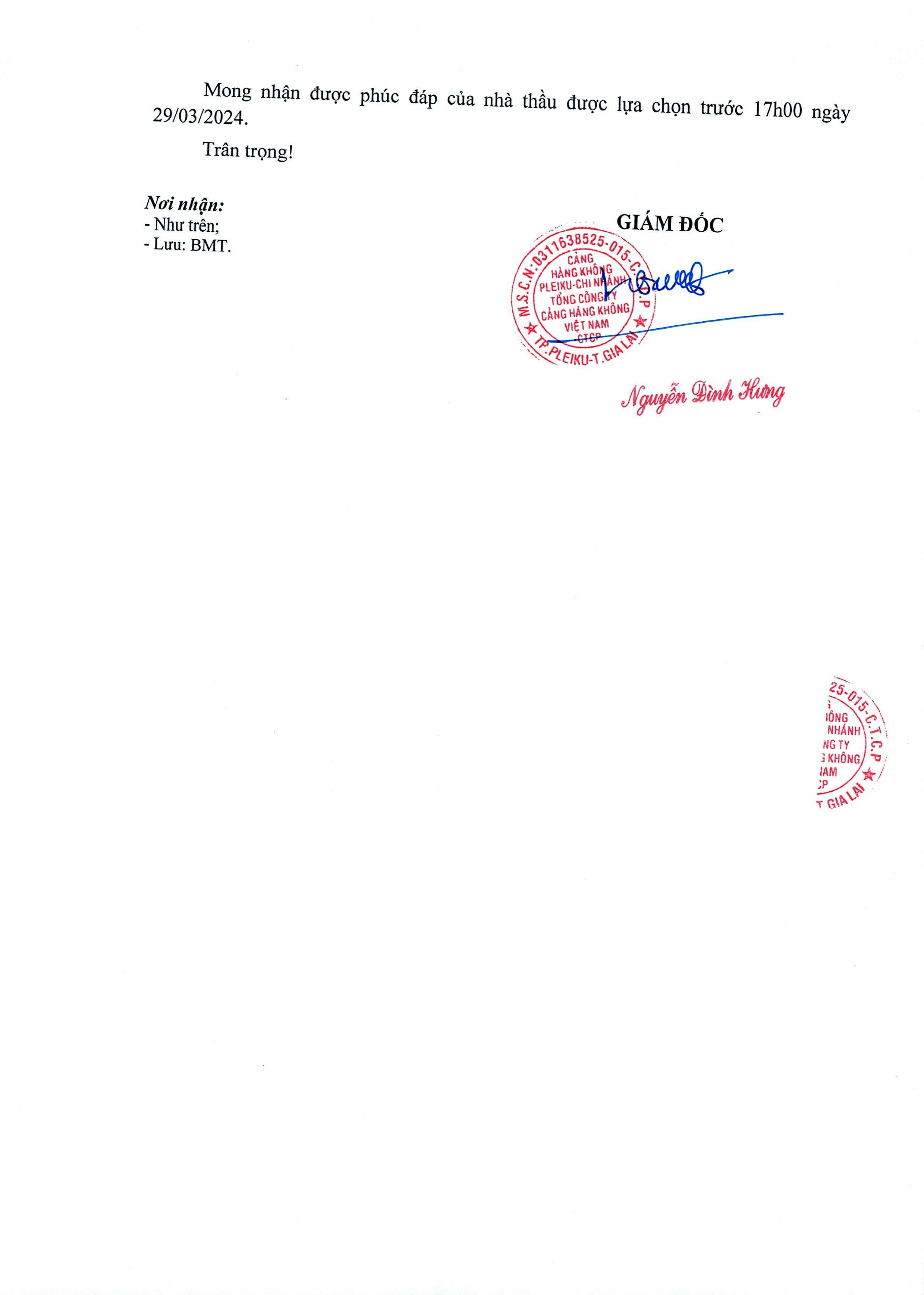 Thông báo mời chào giá về việc "Bảo dưỡng định kỳ hệ thống xử lý nước thải sinh hoạt 06 tháng cuối năm 2025 tại Cảng hàng không Pleiku" (08/11)
