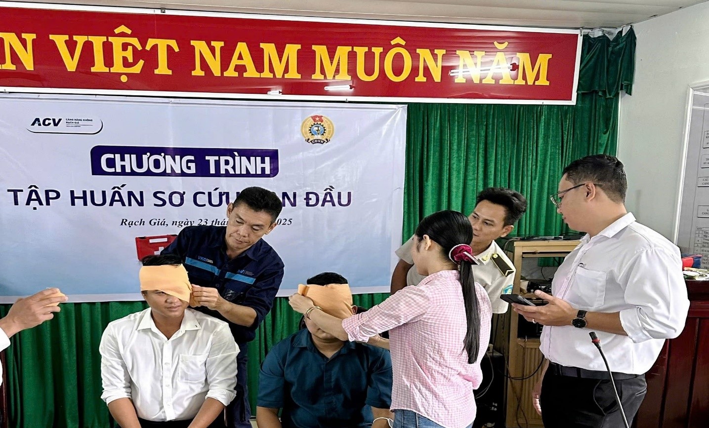 Hoạt động tập huấn sơ cứu ban đầu cho nhân viên Cảng hàng không Rạch Giá nhằm tăng cường năng lực ứng phó khẩn cấp, góp phần đảm bảo an toàn cho hành khách và nhân viên trong mọi tình huống.