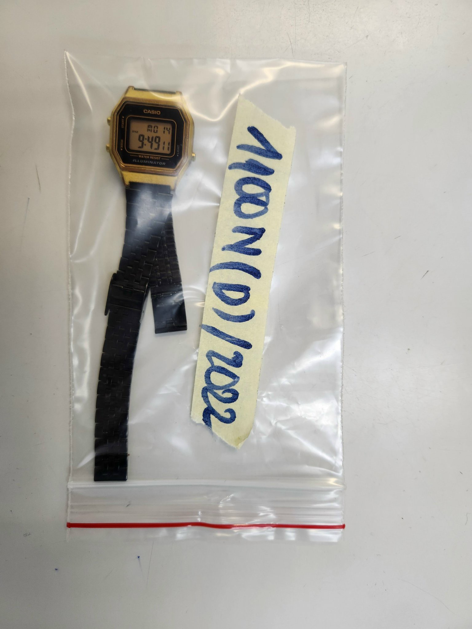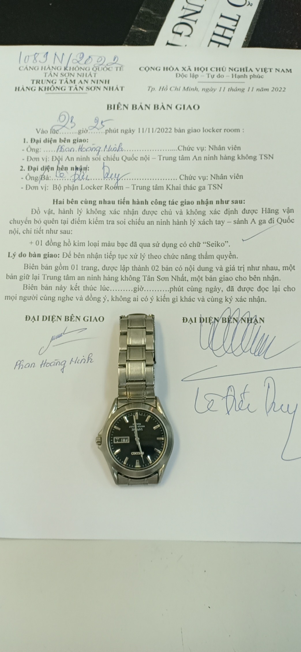 Ngày tiếp nhận: 16/11/2022 Mô tả: 01 đồng hồ dây nhựa đen, không có nhãn hiệu. Vị trí: An ninh soi chiếu quốc tế |