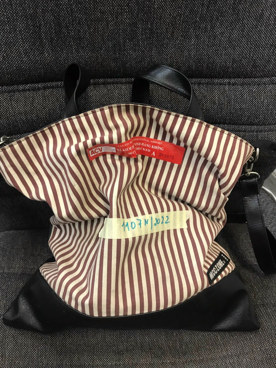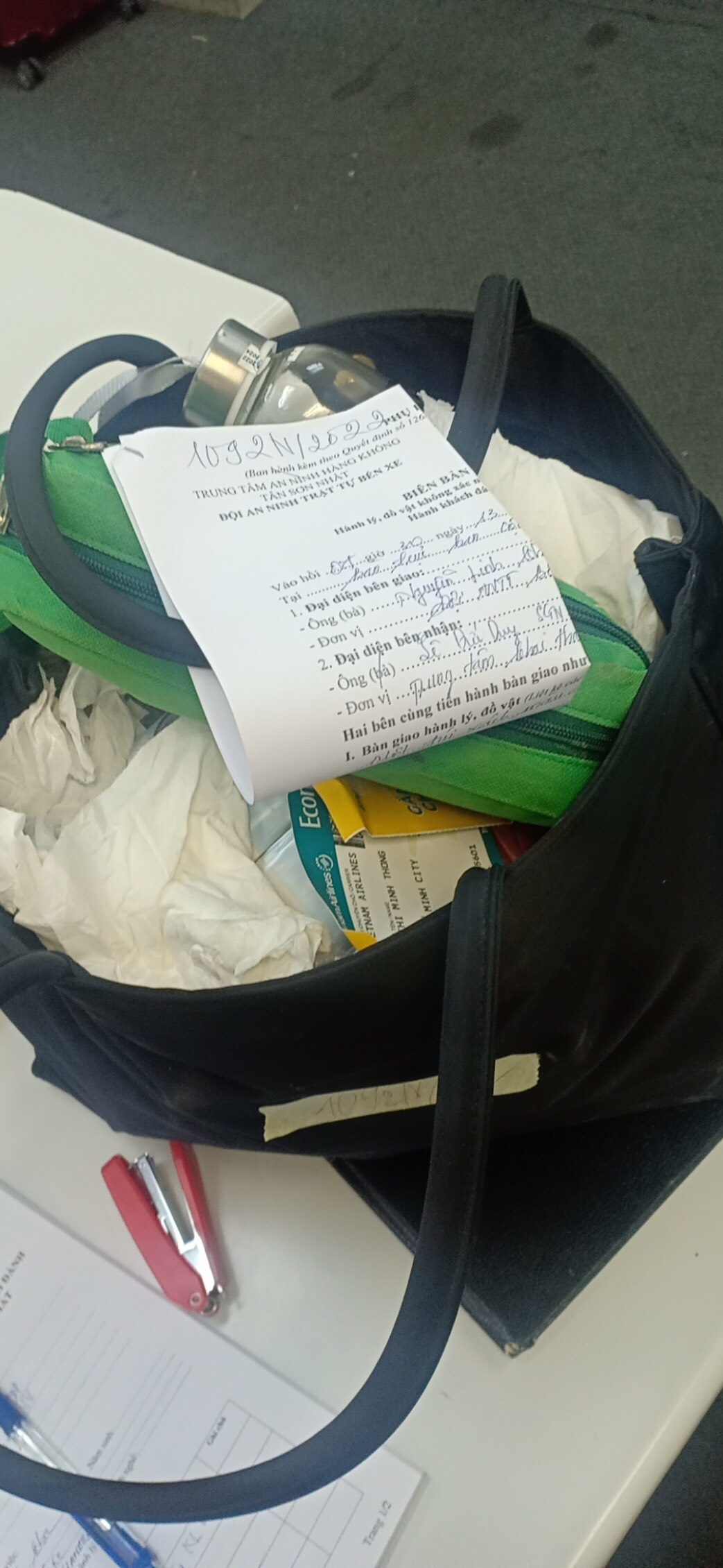 Ngày tiếp nhận: 14/11/2022 Mô tả: 01 túi cầm tay màu đen bên trong gồm: 01 sạc laptop màu đen hiệu NEC đã sử dụng; 01 số đồ ăn quần áo cũ. Vị trí: An ninh soi chiếu quốc tế |