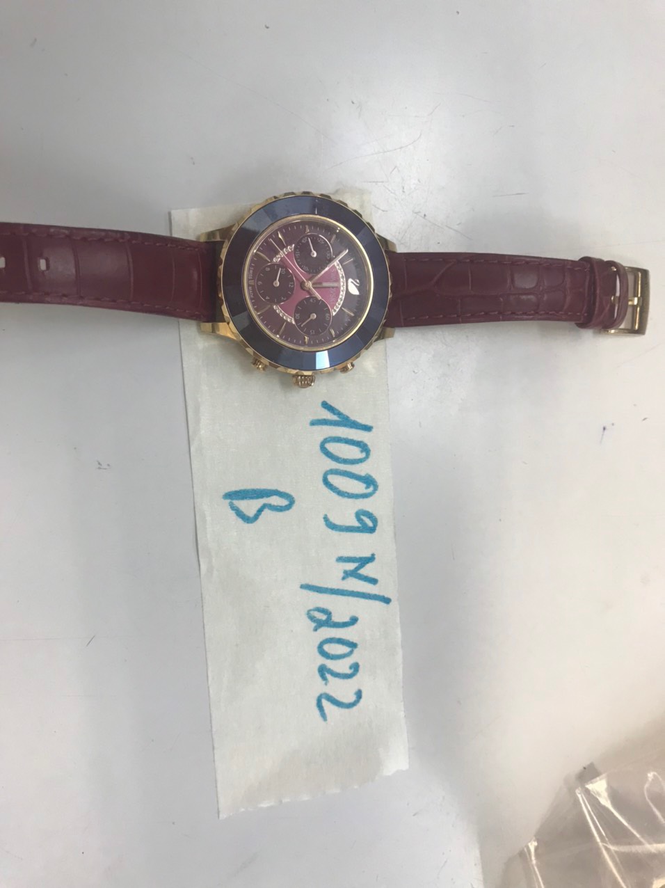 Ngày tiếp nhận: 27/10/2022 Mô tả: 01 đồng hồ dây da màu đỏ WAROVSKI đã sử dụng. Vị trí: An ninh soi chiếu quốc nội |