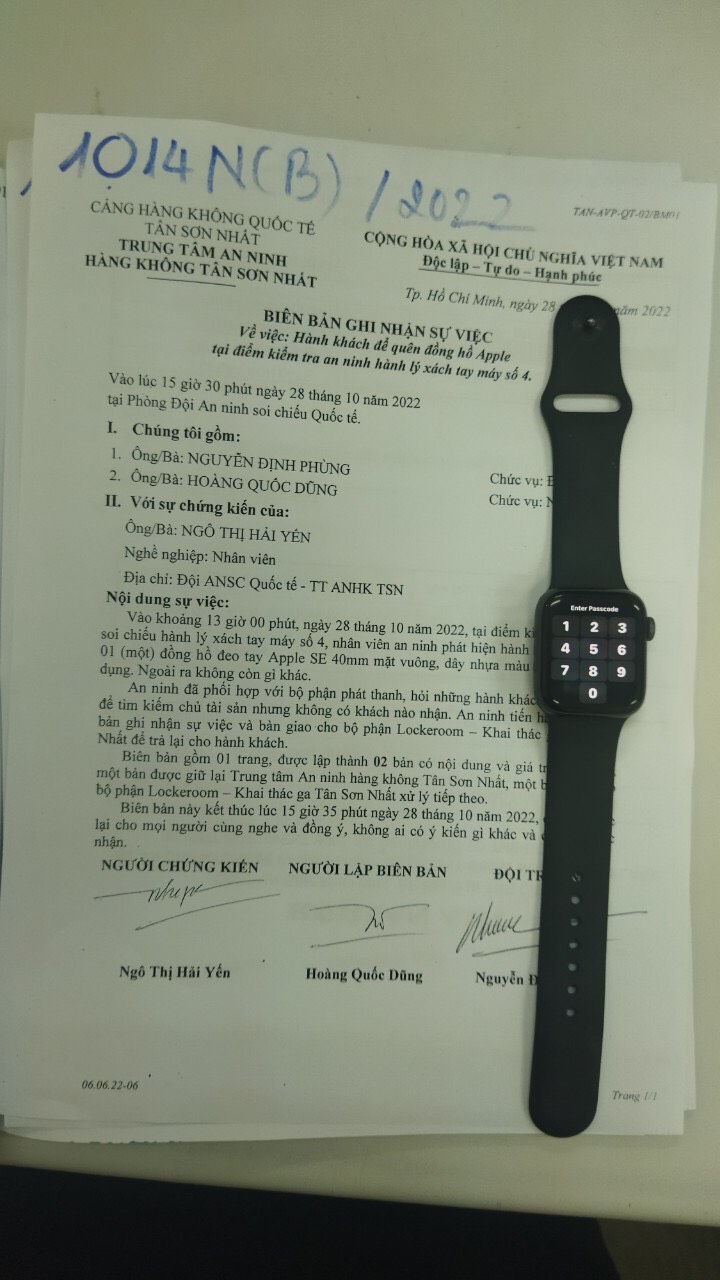Ngày tiếp nhận: 28/10/2022 Mô tả: 01 đồng hồ đeo tay Apple SE 40mm mặt vuông, dây nhựa màu đen. Vị trí: An ninh soi chiếu quốc tế |