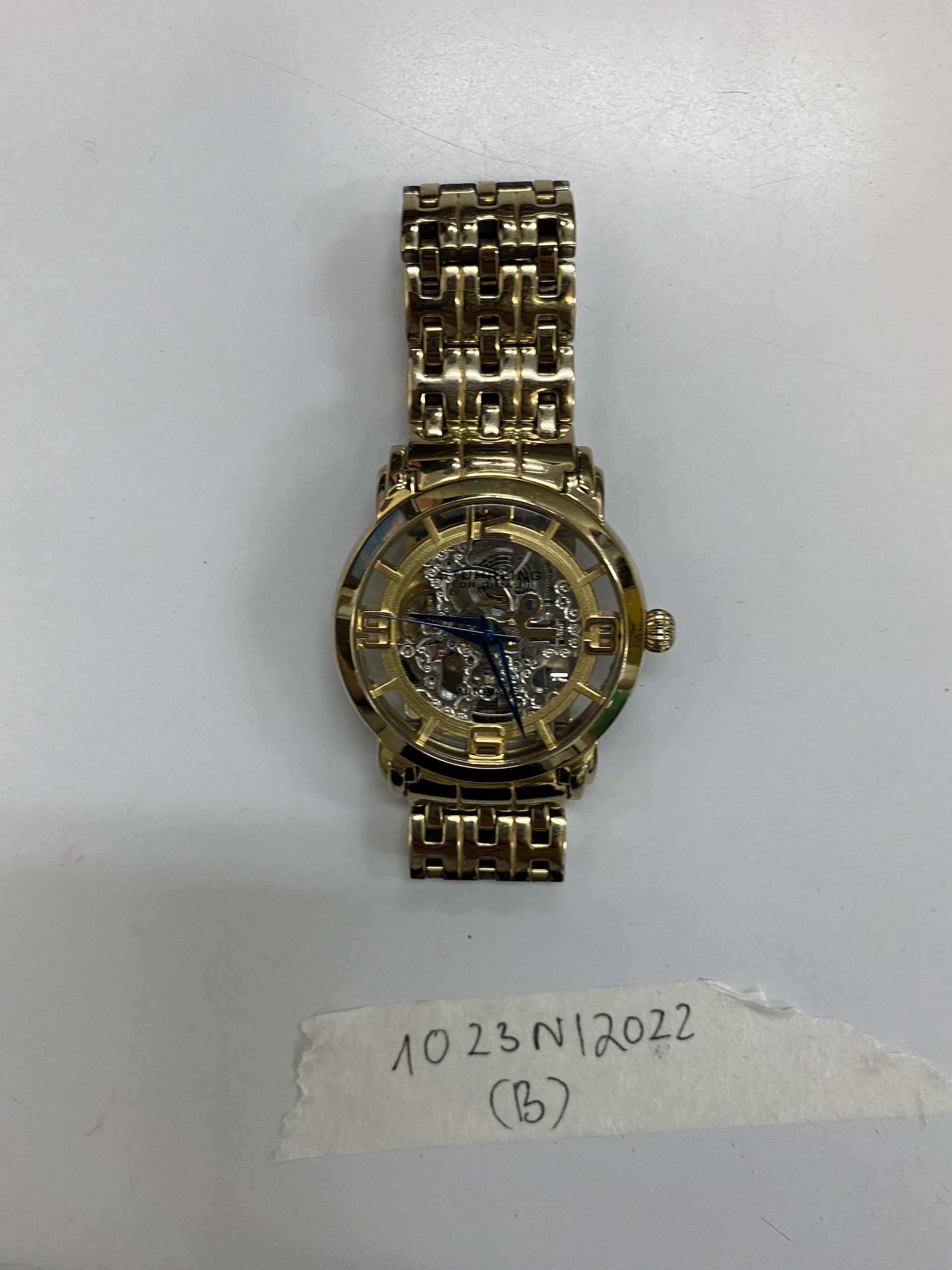 Ngày tiếp nhận: 29/10/2022 Mô tả: 01 đồng hồ kim loại màu vàng STUHRLING. Vị trí: An ninh soi chiếu quốc nội |