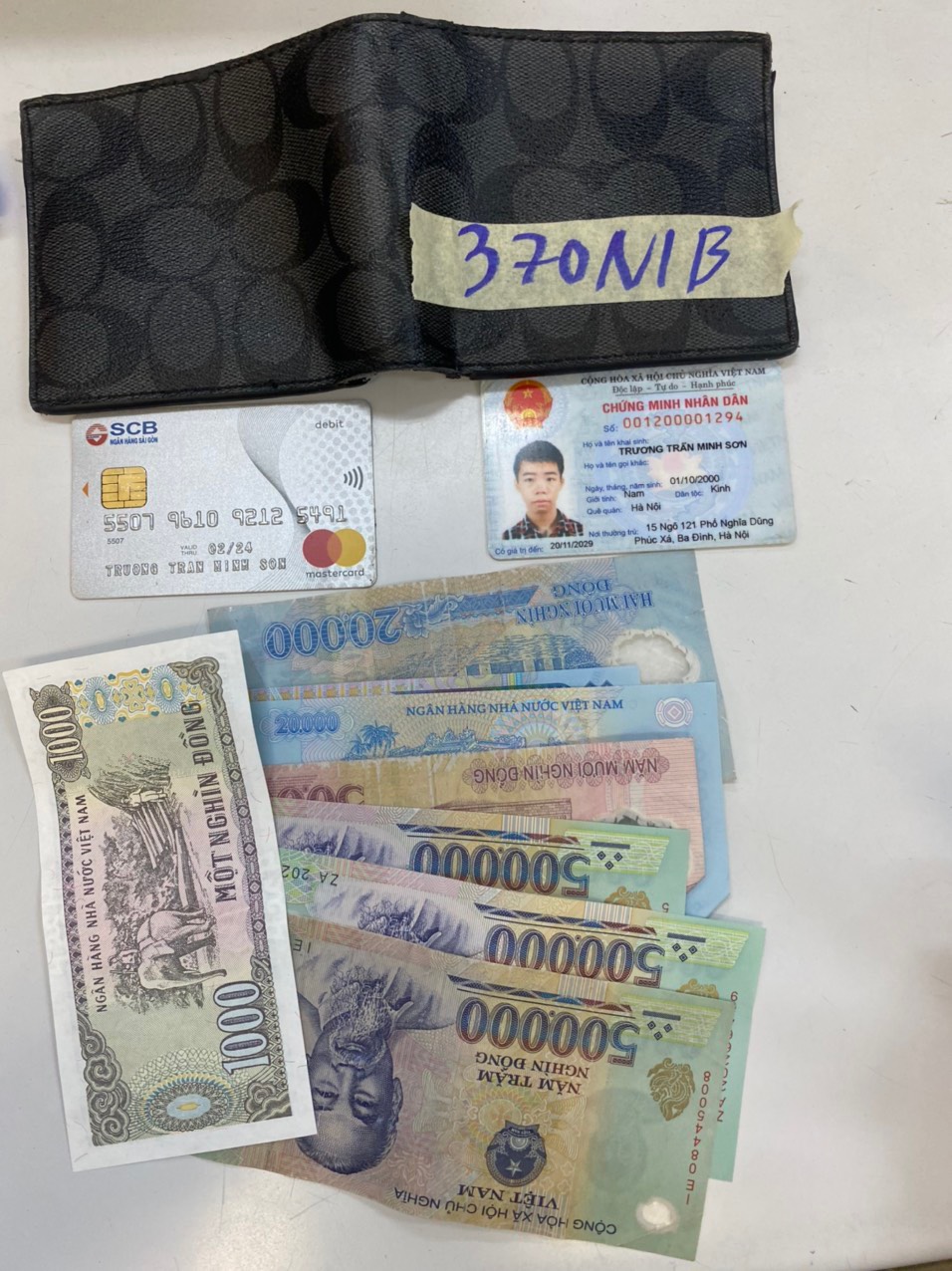 | 24 | Ngày tiếp nhận: 12/03/2023 Mã hồ sơ: 370N2023B Mô tả: 01 ví da màu đen bên trong có: 01 CCCD, 01 thẻ Ngân hàng đều mang tên TRƯƠNG TRẦN MINH SƠN, 03 tờ 500.000 VND, 01 tờ 50.000 VND, 03 tờ 20.000 VND, 01 tờ 1000 VND. Vị trí: An ninh soi chiếu quốc nội |