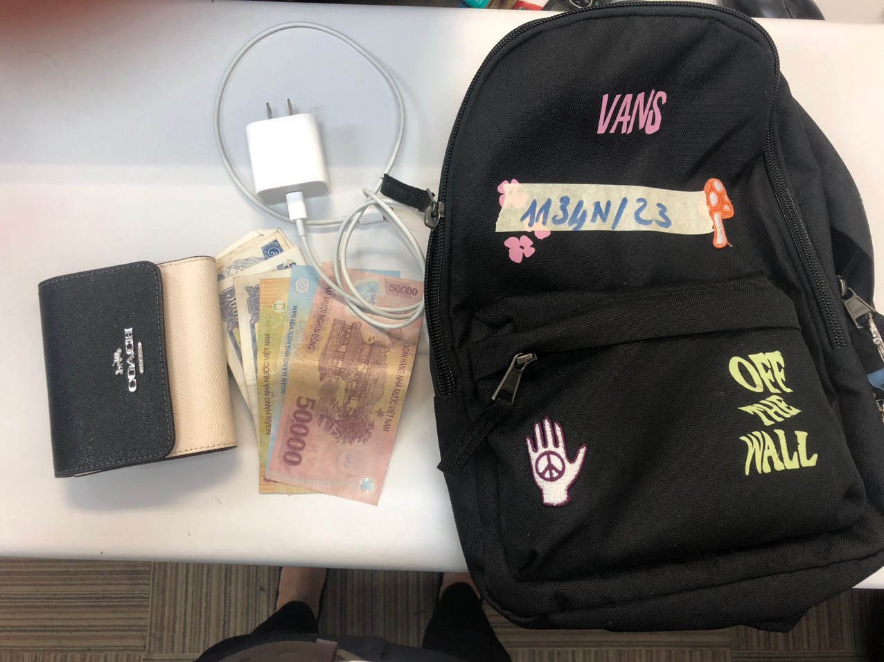 Ngày tiếp nhận: 13/8/2023 Mã hồ sơ: 1134N2023 Mô tả: 01 balo vải màu đen bên trong chứa: 01 ví màu trắng đen có chữ COACH, 01 sạc điện thoại, 01 dây sạc màu trắng, 110000VNĐ, đồ dùng cá nhân. Vị trí: An ninh trật tự quốc tế |