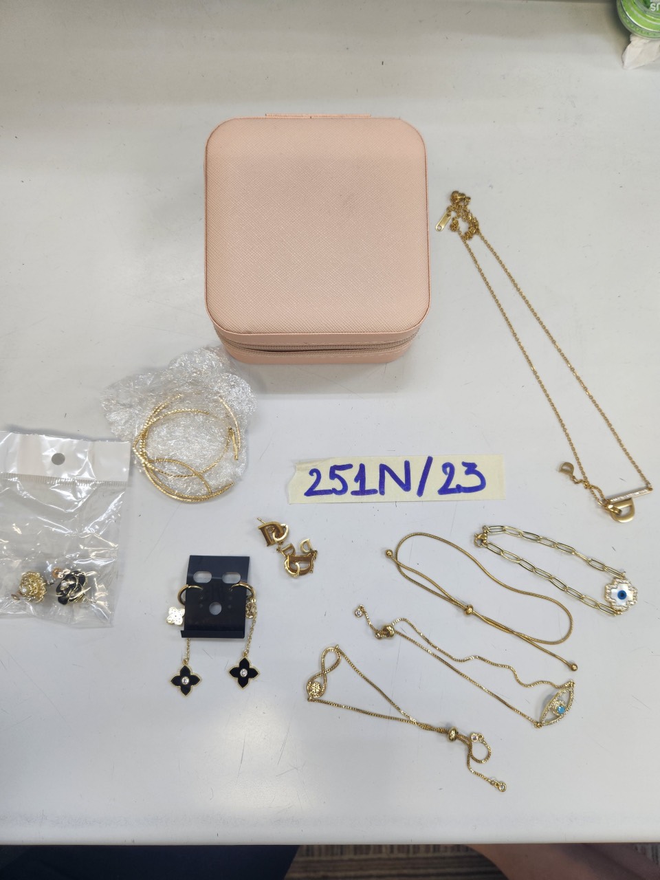 Ngày tiếp nhận: 17/02/2023 04 sợi dây lắc đeo tay kim loại màu vàng; 01sợi dây chuyền kim loại màu vàng; 04 đôi bông tai kim loại màu vàng. |