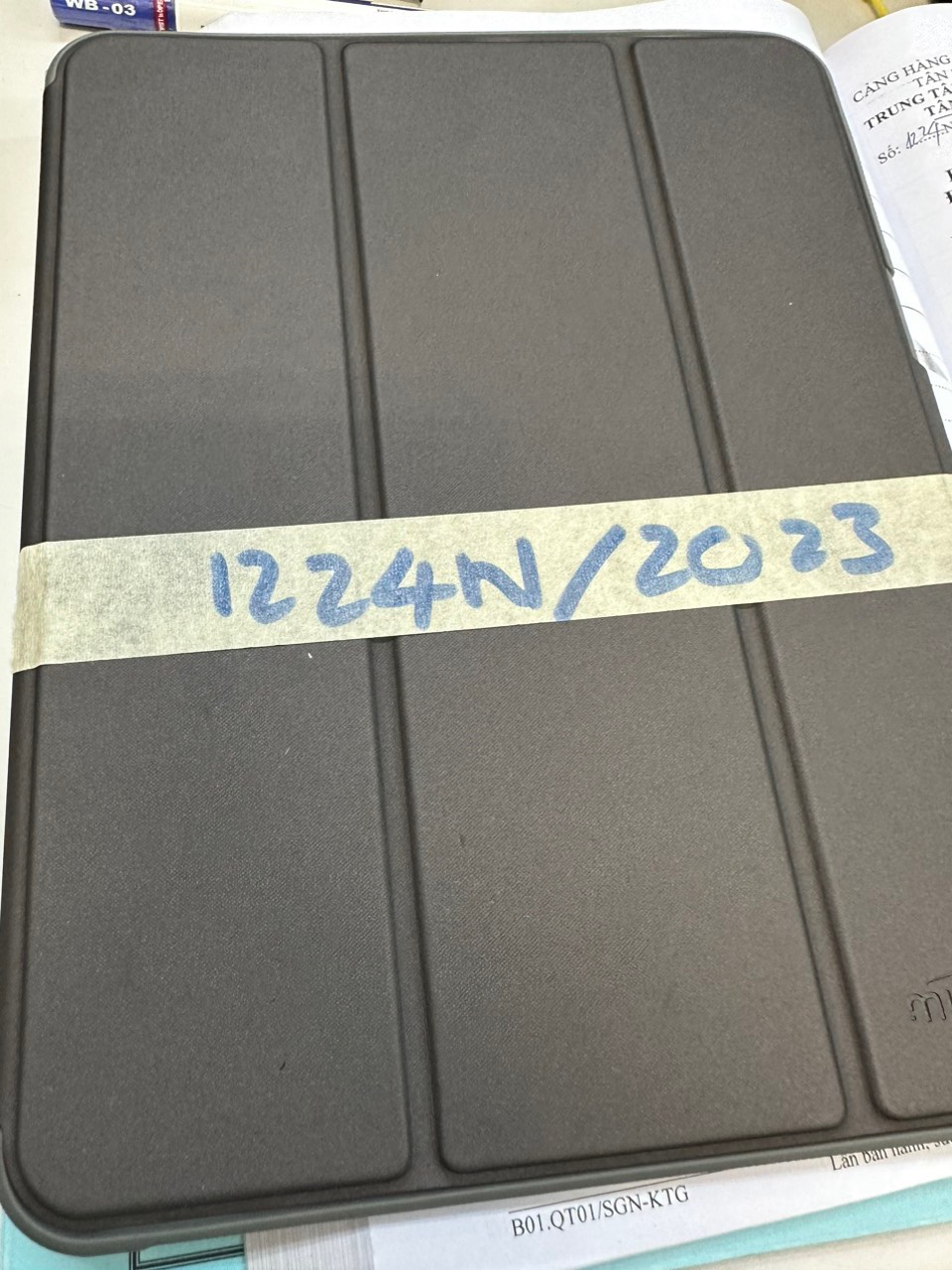Ngày tiếp nhận: 27/8/2023 Mã hồ sơ: 1224N2023 Mô tả: 01 IPAD màu đen có bao nhựa bên ngoài màu xám. Vị trí: An ninh soi chiếu quốc nội |