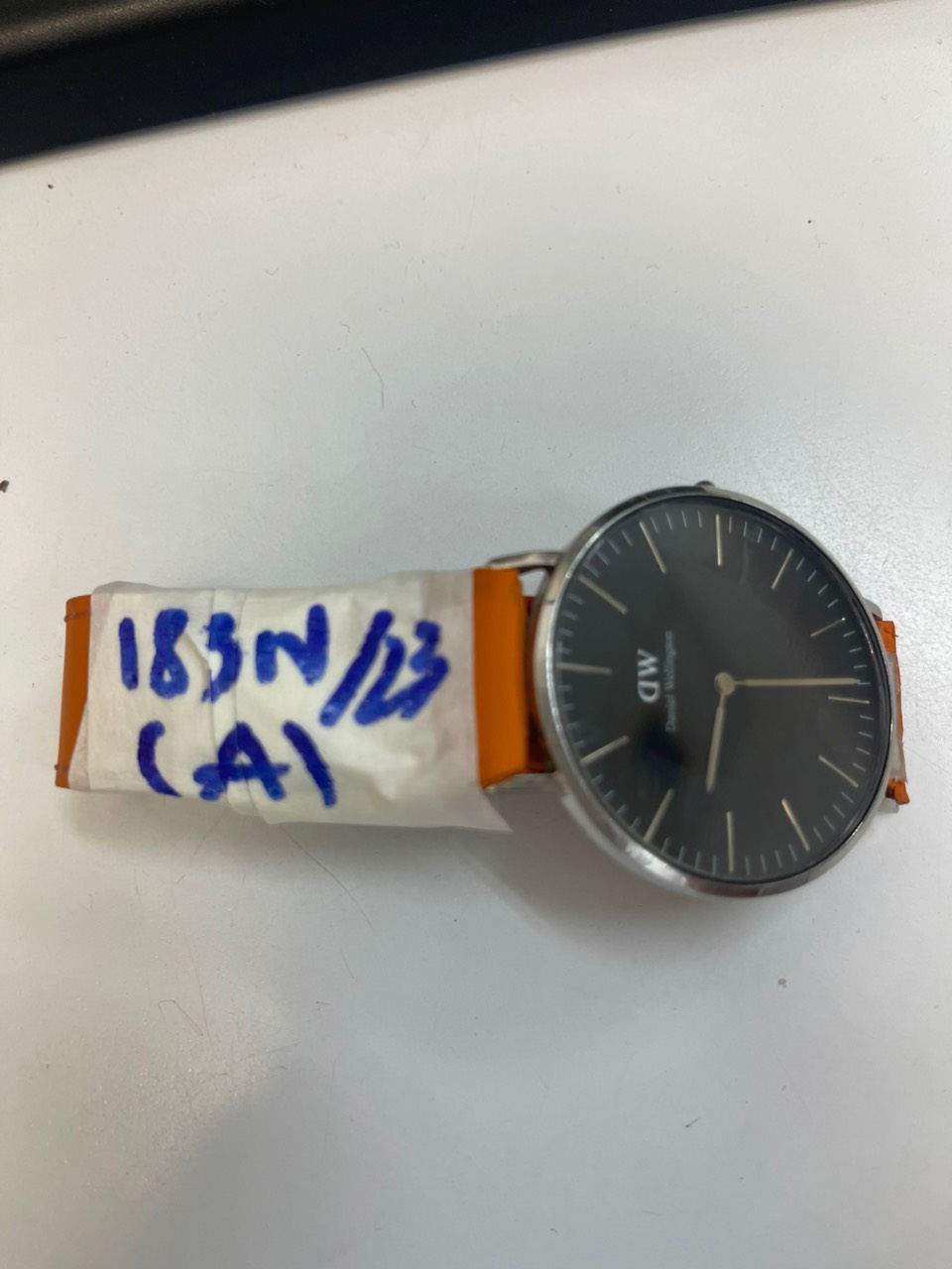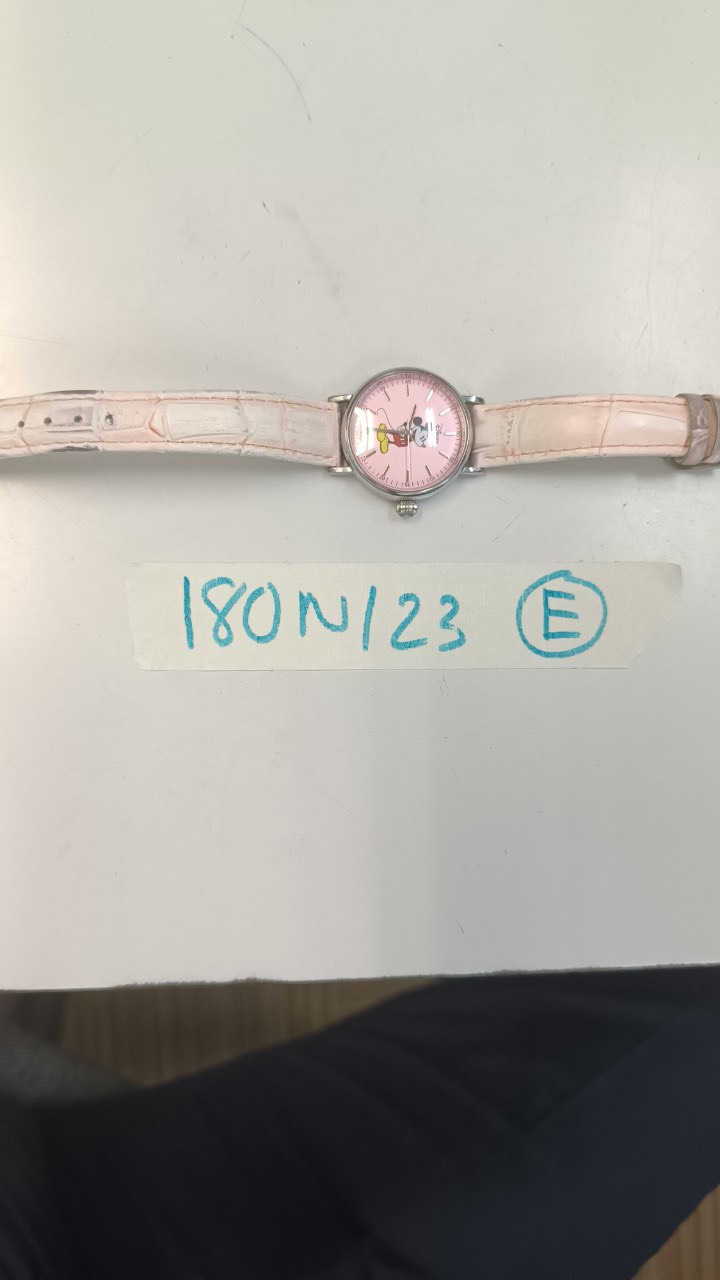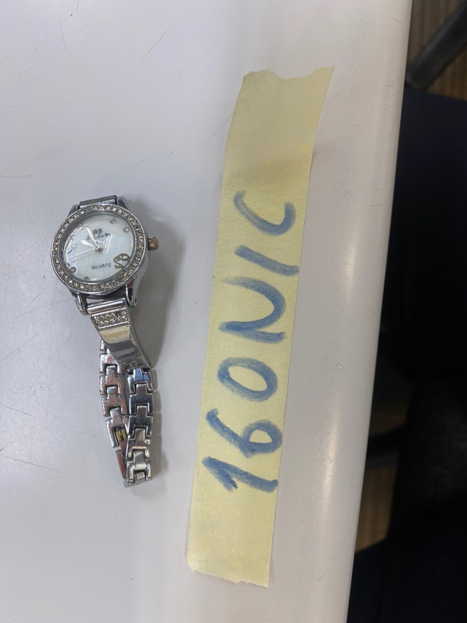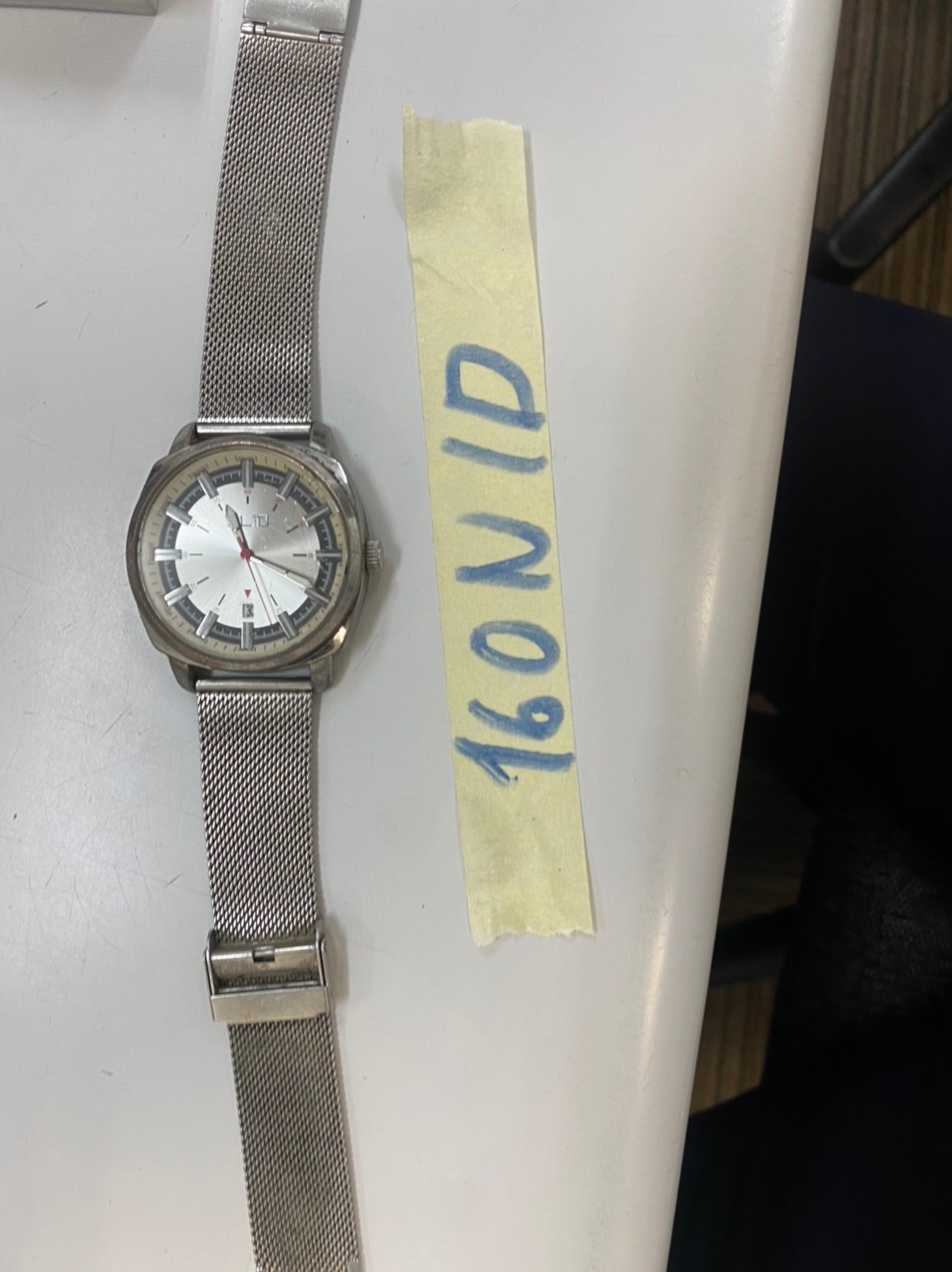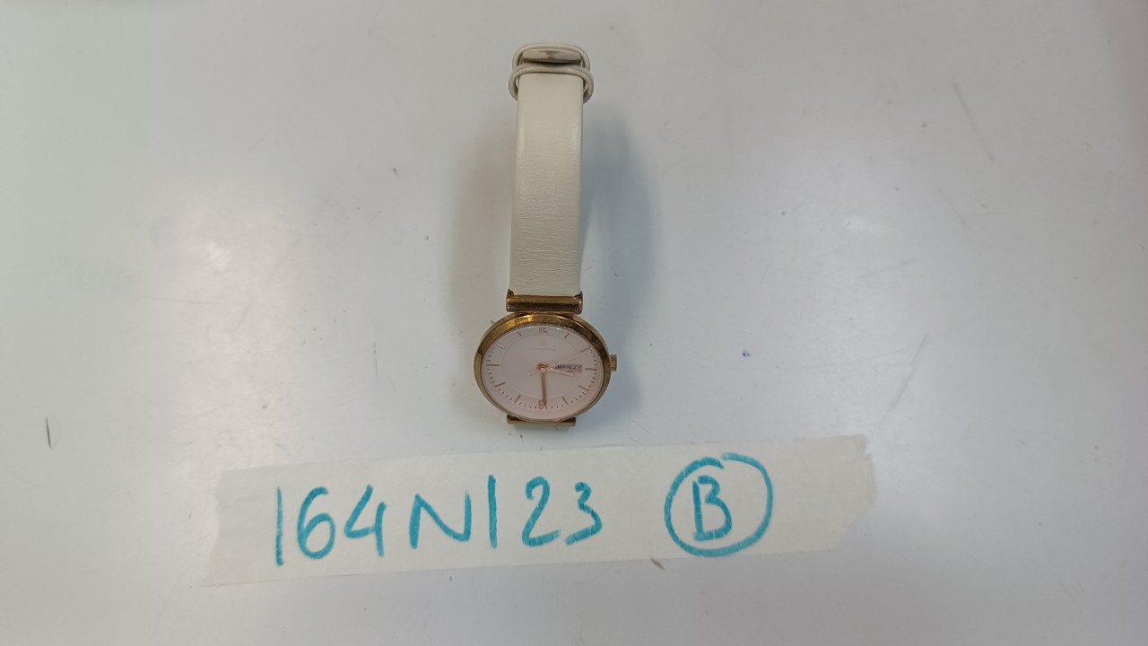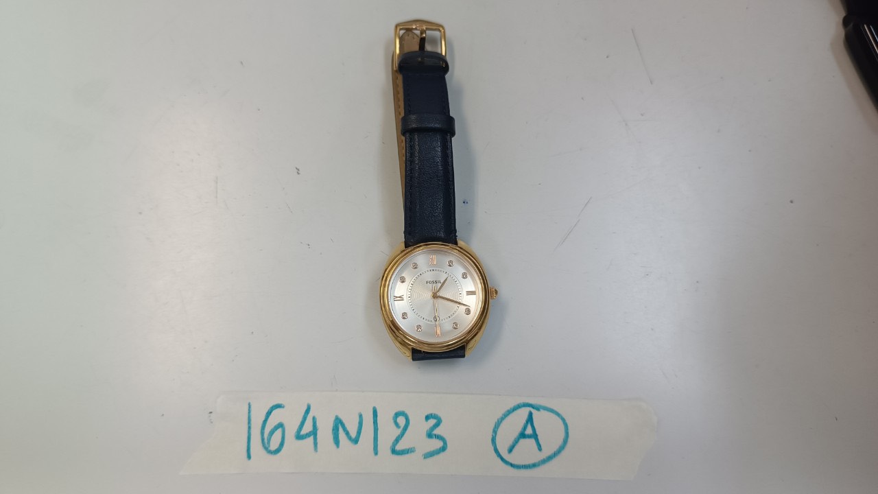 Ngày tiếp nhận: 03/02/2023 Mã hồ sơ: 183N2023C Mô tả: 01 đồng hồ dây kim loại màu vàng, mặt tròn hồng có chữ SUNRISE. Vị trí: An ninh soi chiếu quốc nội |