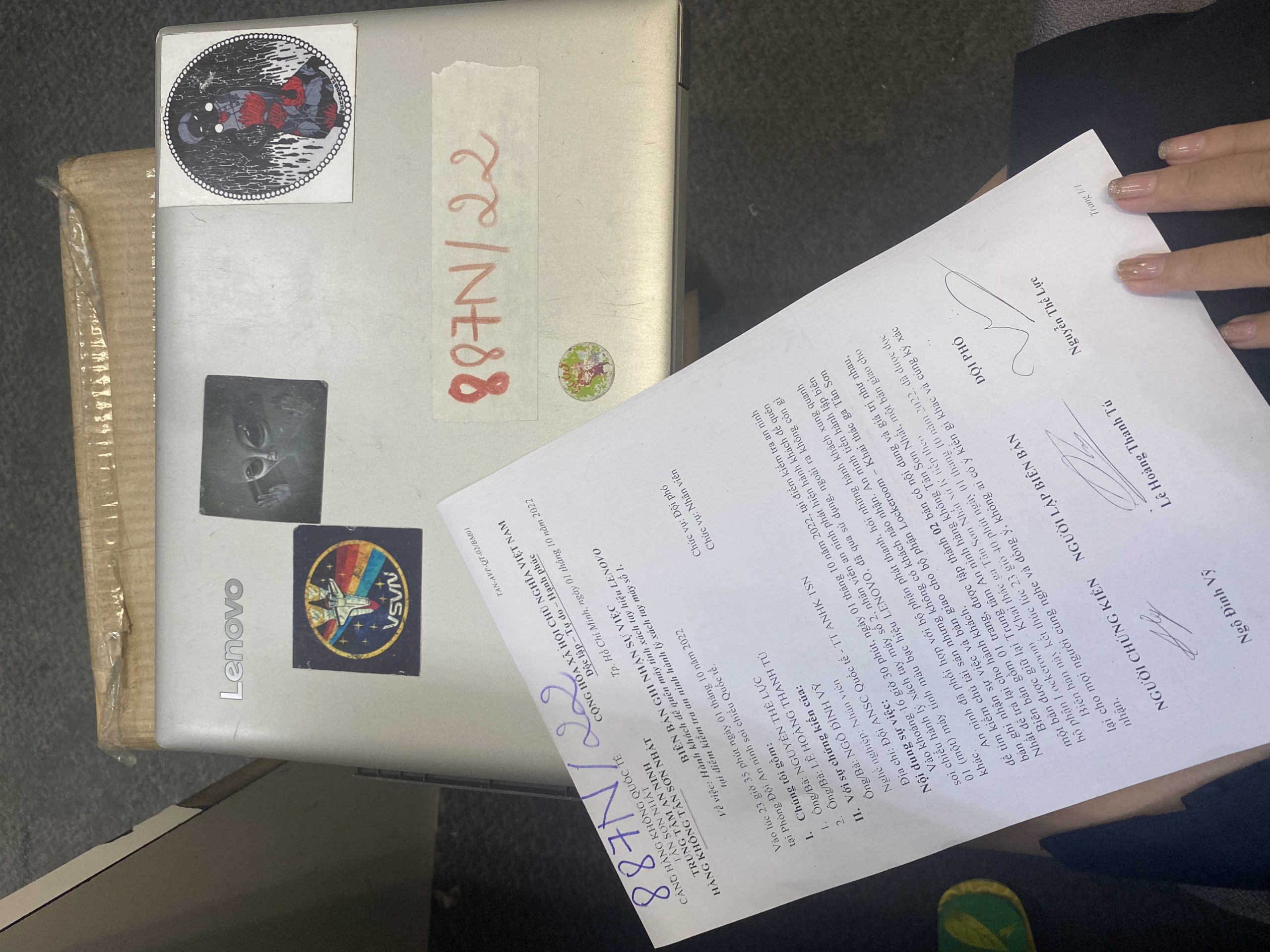 Ngày tiếp nhận: 05/10/2022 Mô tả: 01 valy màu vàng có 01 laptop ASUS màu đen model 15SFQ2558TU, 03 tập hồ sơ, 02 bộ sạc laptop đã qua sử dụng. Vị trí: An ninh trật tự quốc tế |