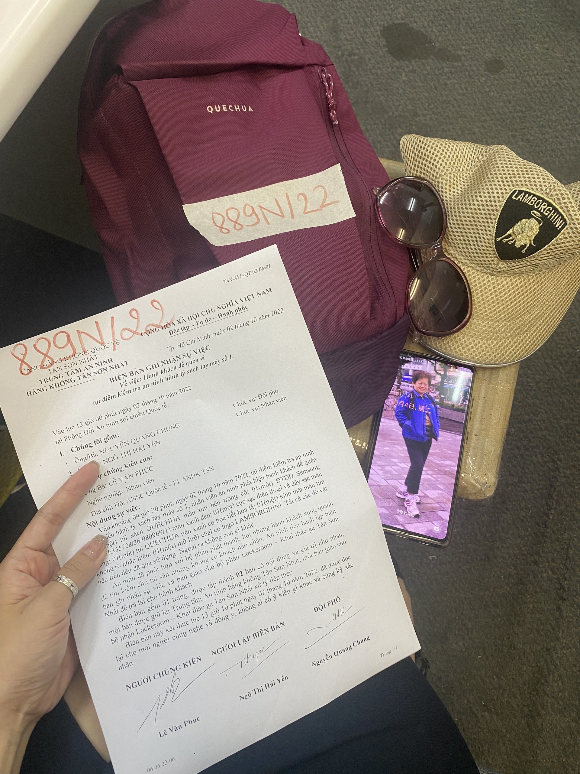 Ngày tiếp nhận: 04/10/2022 Mô tả: 01 túi sách Quechua màu tím bên trong có 1 điện thoại Samsung màu xanh, 01 cục sạc điện thoại dây sạc trắng , 01 túi Quechua nền xanh, 01 túi màu tím, 01 mũ lưỡi trai logo Lamborgini. Vị trí: An ninh soi chiếu quốc tế |
