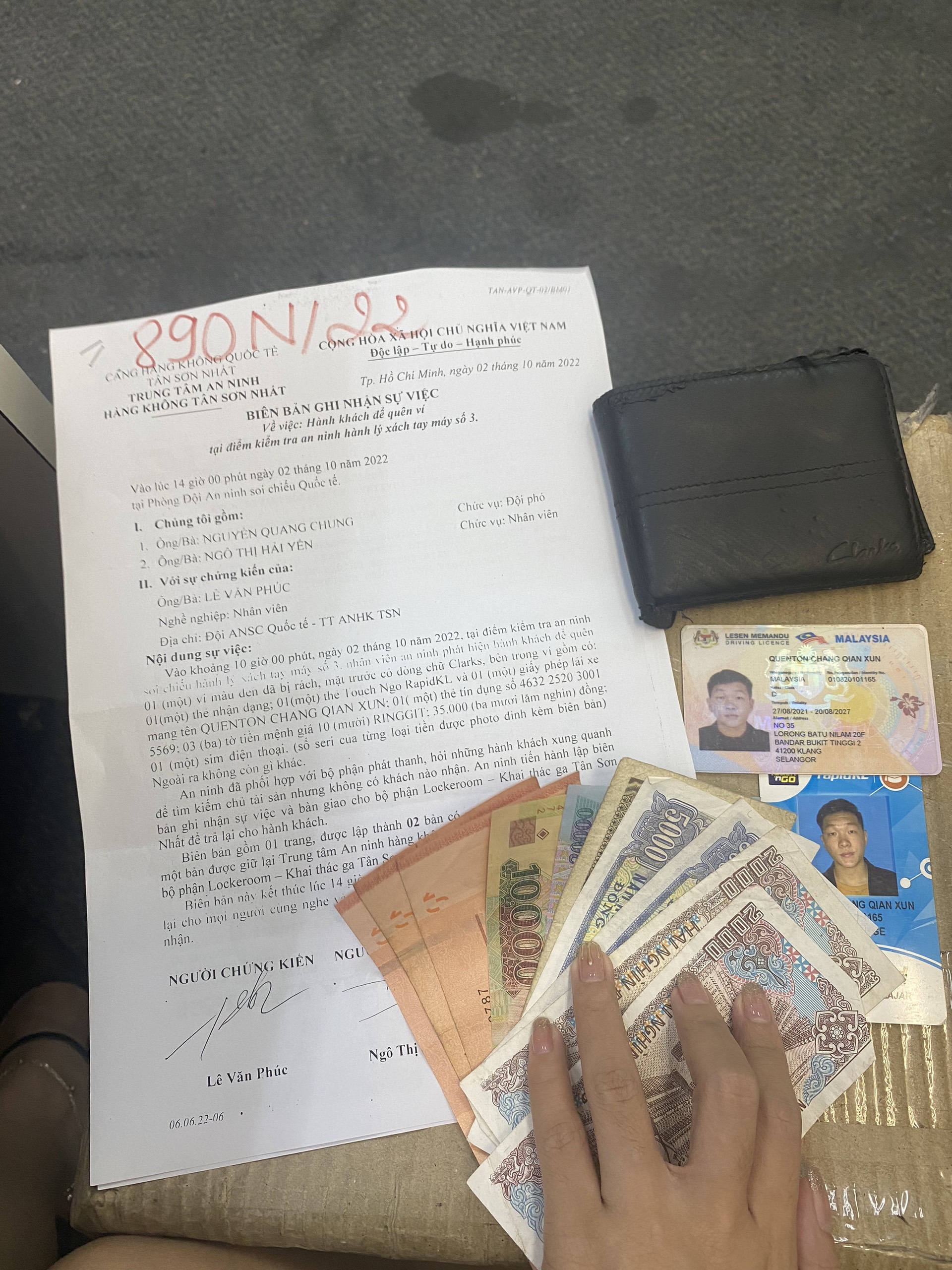 Ngày tiếp nhận: 04/10/2022 Mô tả: 01 ví da màu xanh có dòng chữ Clarks , có 1 thẻ nhận dạng, có 1 thẻ Ngo Rapidld, 1 GPLX tên Quenton Giang Quian Xun, 01 thẻ tín dụng, 3 tờ mệnh giá 10 Ringit, 35000VND, 1 sim điện thoại. Vị trí: An ninh soi chiếu quốc tế |