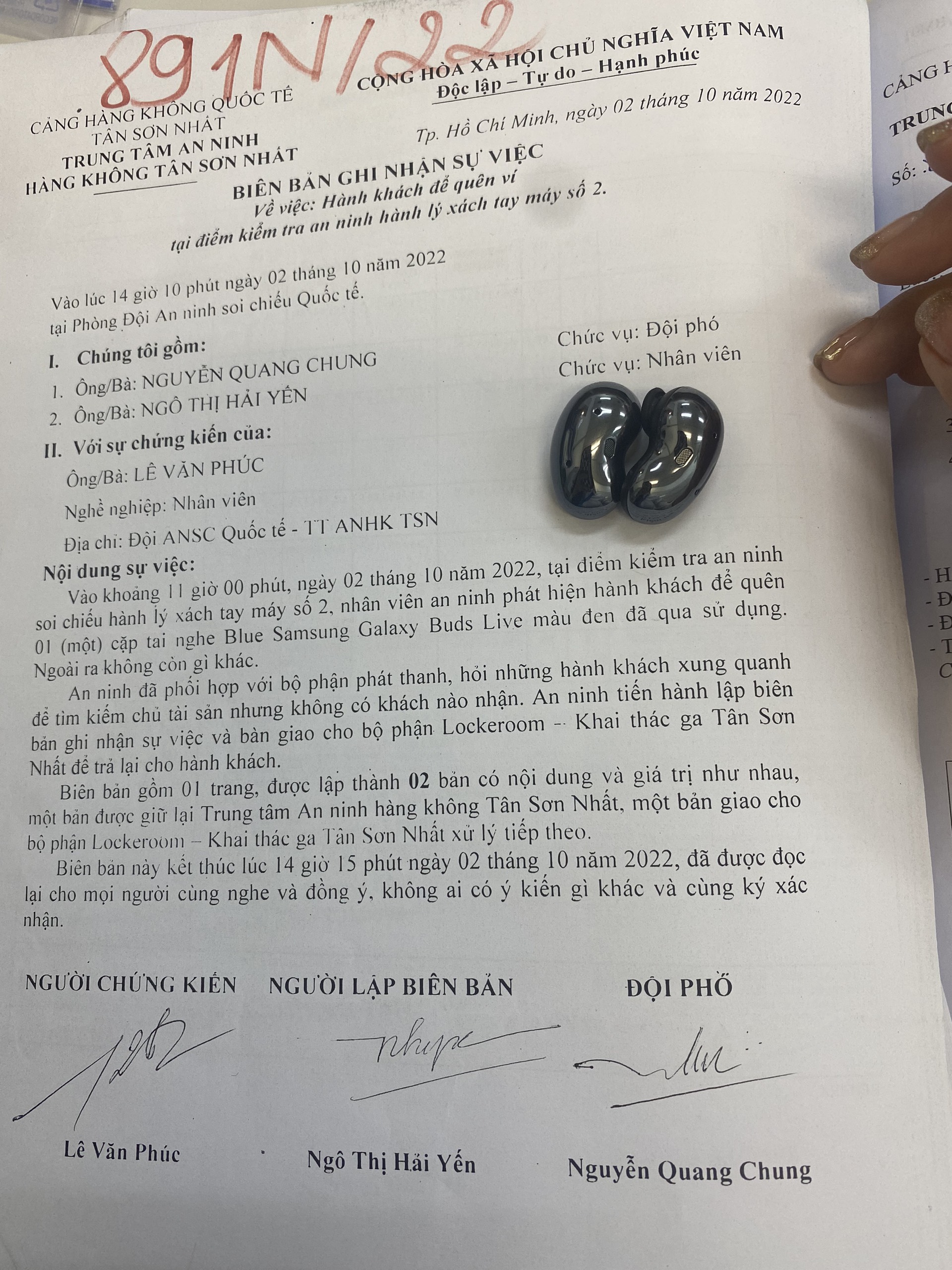 Ngày tiếp nhận: 04/10/2022 Mô tả: 01 cặp tai nghe blue samsung galaxy buds màu đen. Vị trí: An ninh soi chiếu quốc tế |