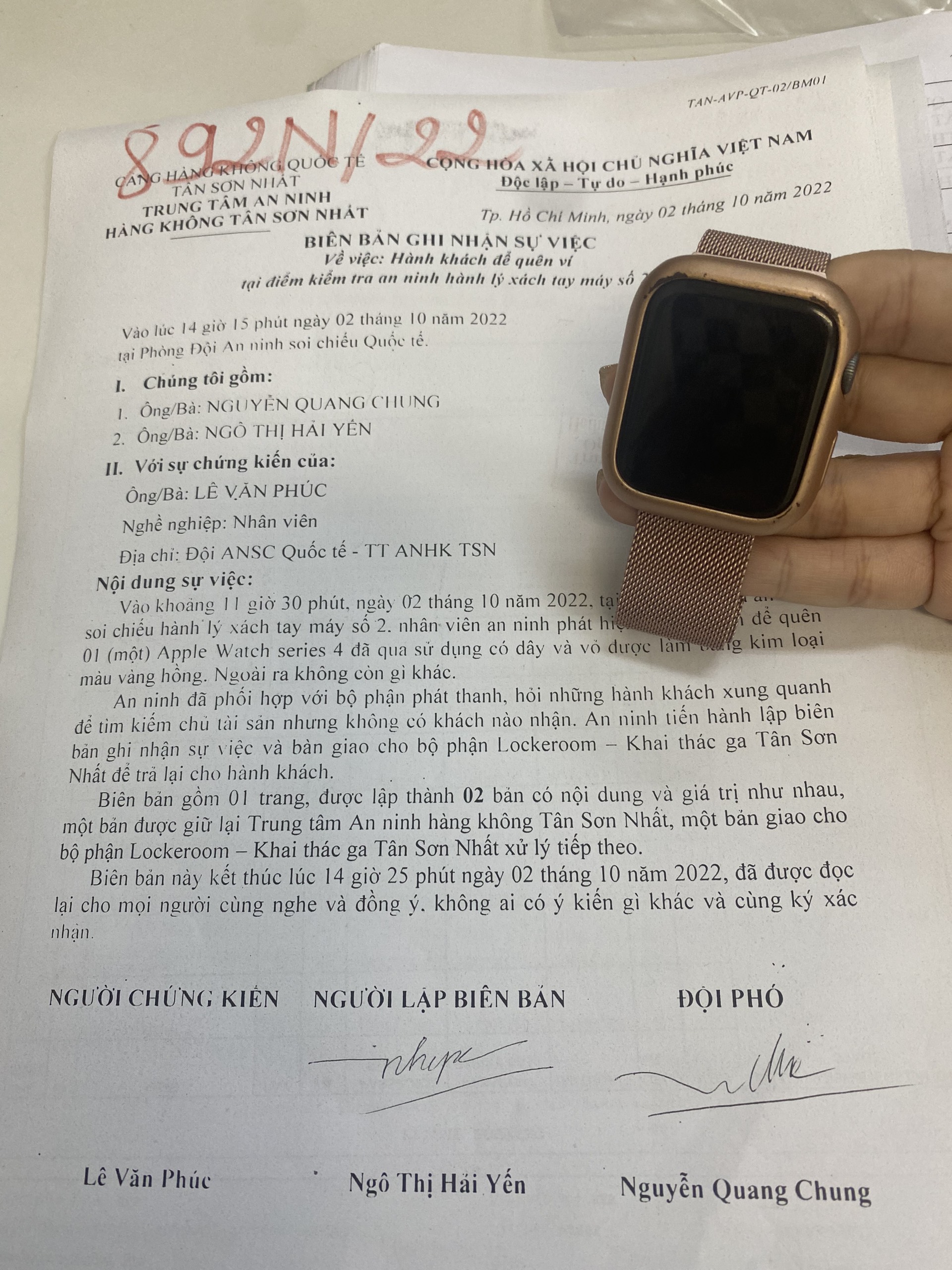 Ngày tiếp nhận: 04/10/2022 Mô tả: 01 apple watch S4 dây và vỏ bằng kim loại màu vàng hồng đã sử dụng. Vị trí: An ninh soi chiếu quốc tế |