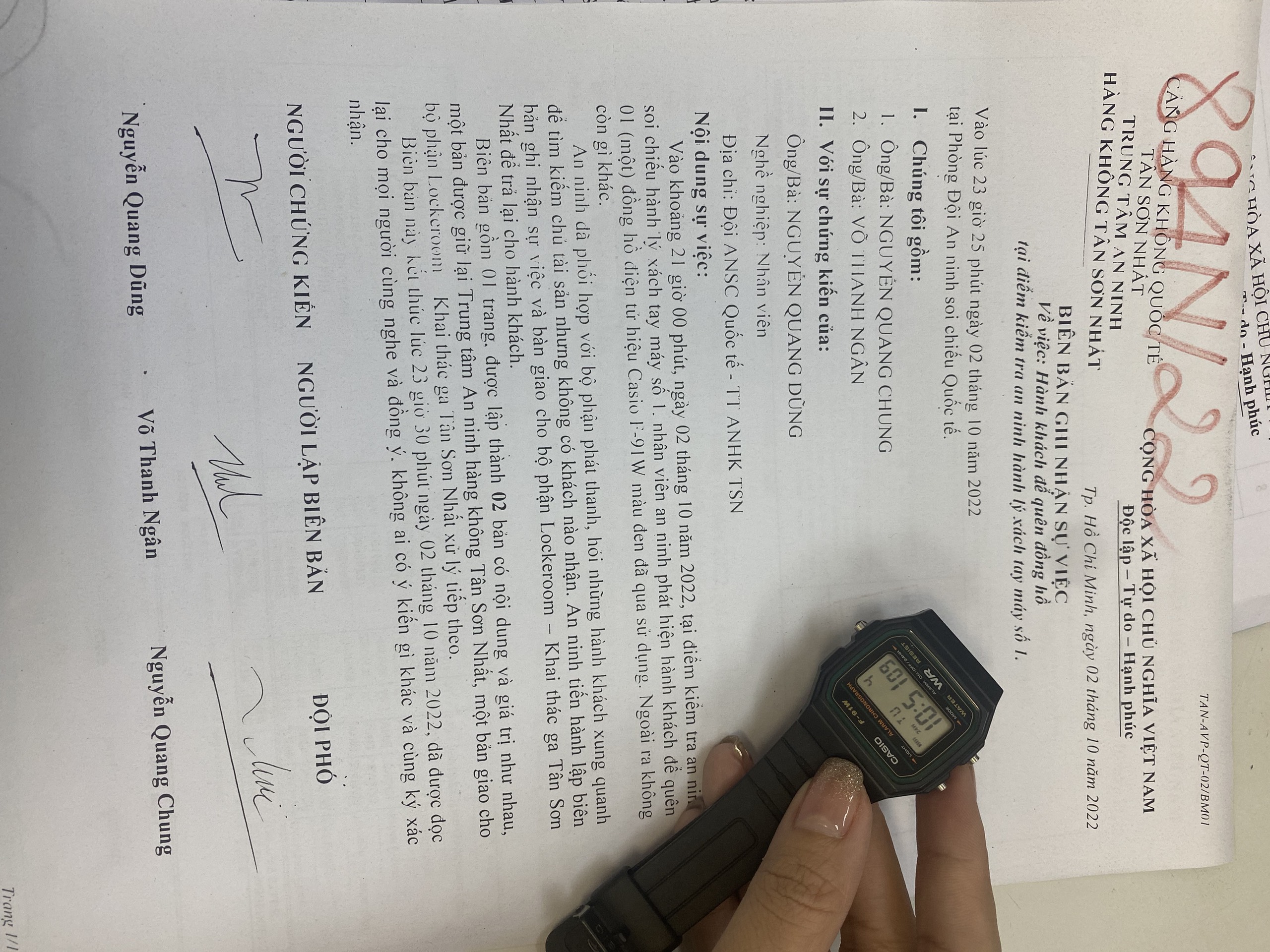 Ngày tiếp nhận: 04/10/2022 Mô tả: 01 đồng hồ điện tử Casio màu đen Vị trí: An ninh soi chiếu quốc tế |