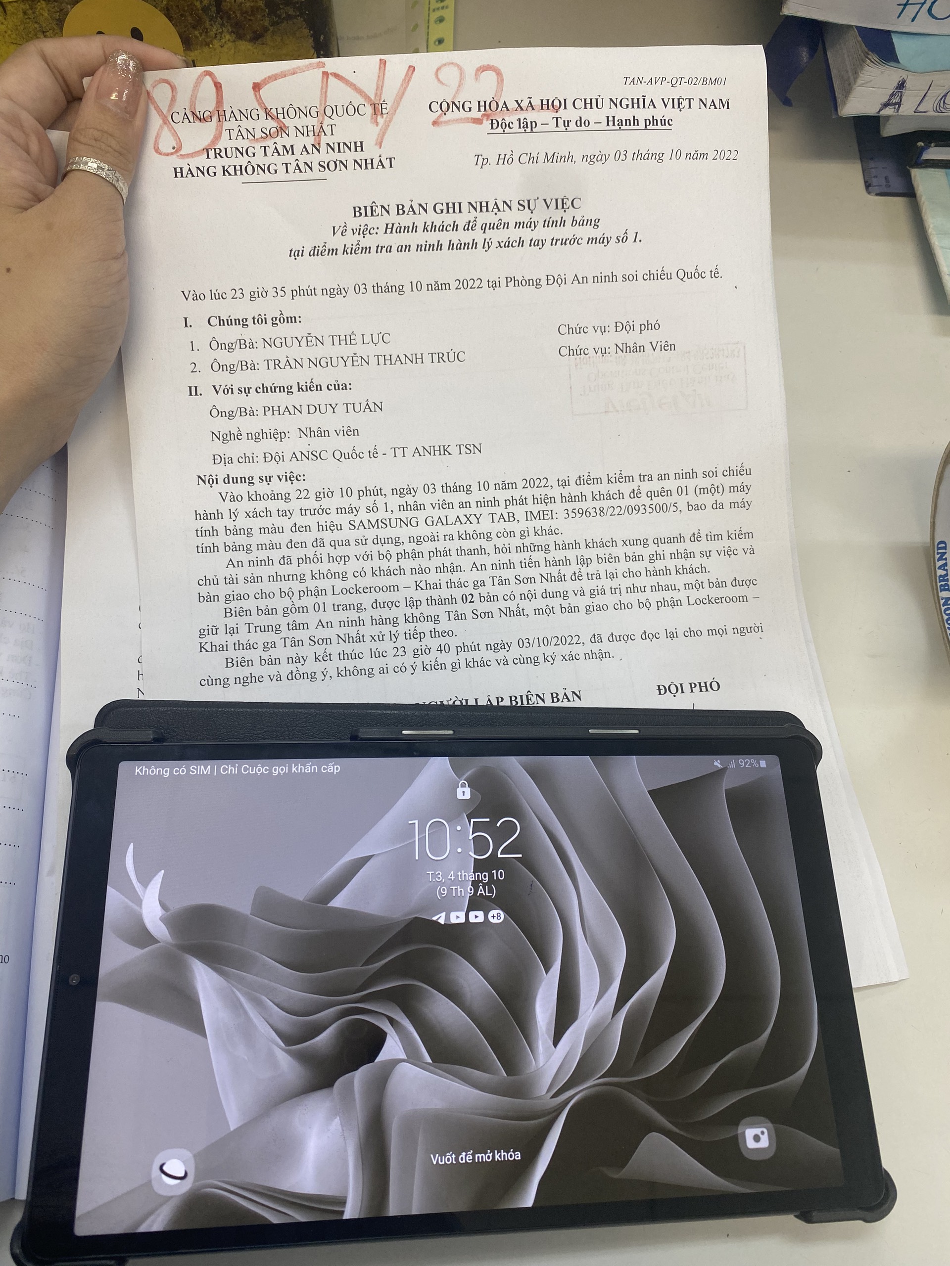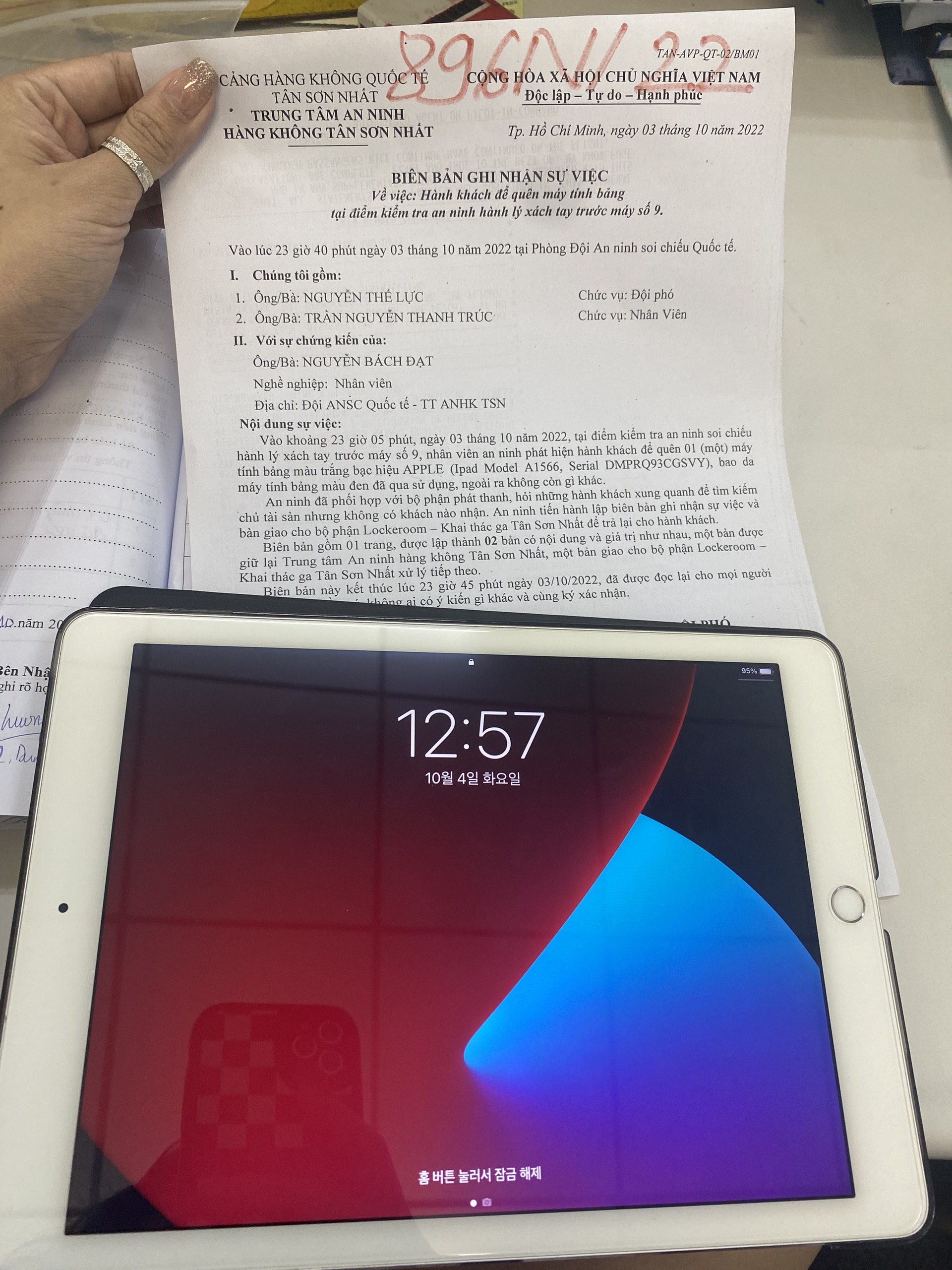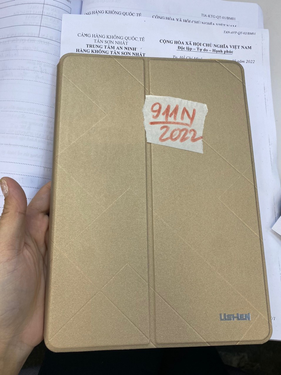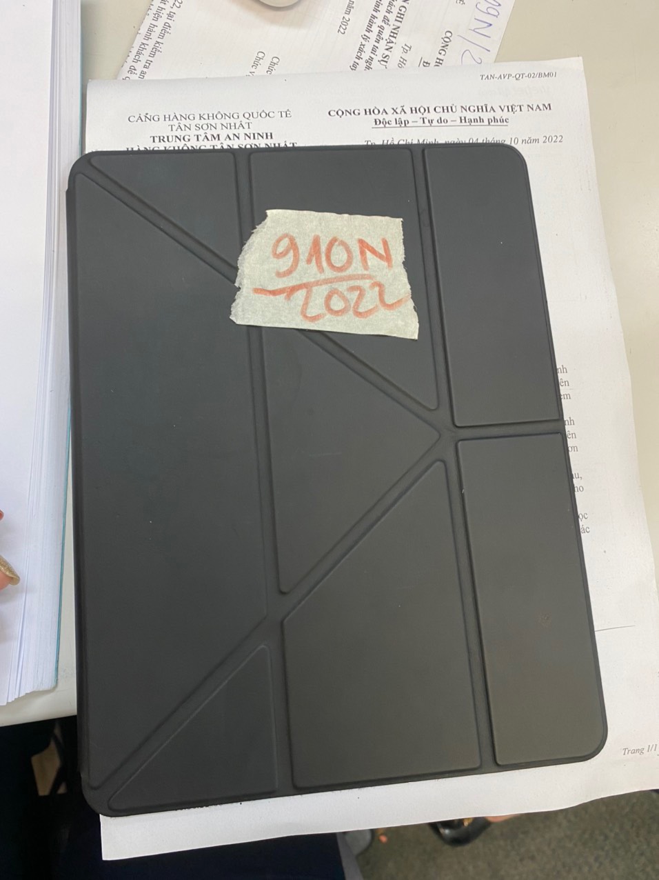 Ngày tiếp nhận: 04/10/2022 Mô tả: 01 máy tính bảng màu trắng hiệu Apple Ipad, bao da màu đen. Vị trí: An ninh soi chiếu quốc tế |