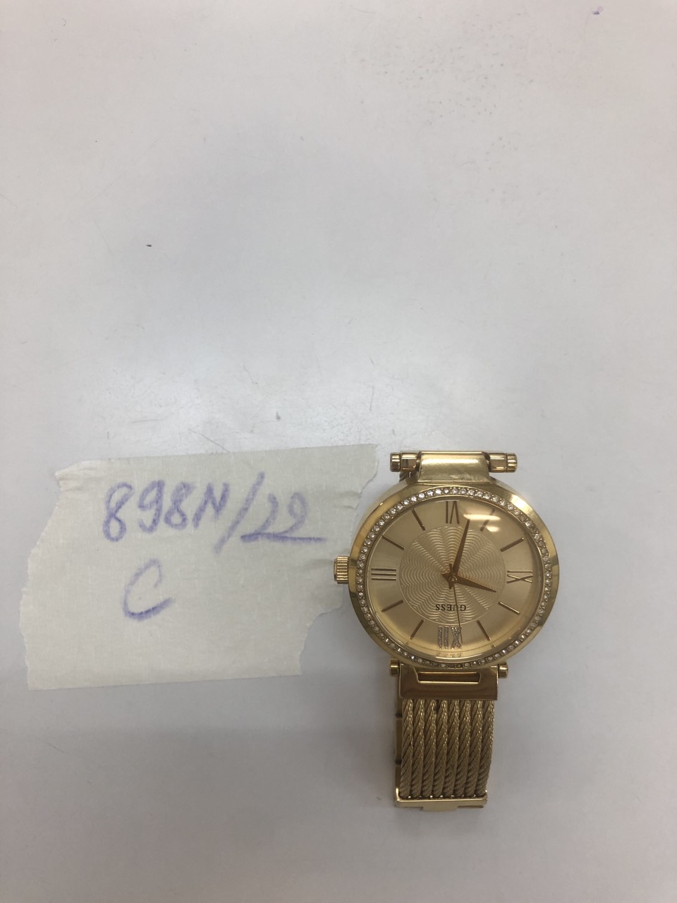 Ngày tiếp nhận: 04/10/2022 Mô tả: 01 đồng hồ kim loại màu vàng Guess. Vị trí: An ninh soi chiếu quốc nội |