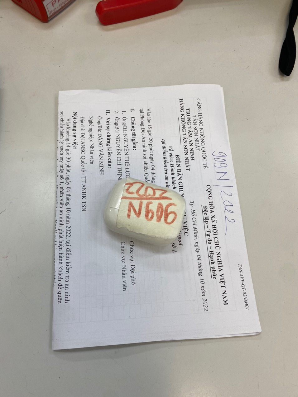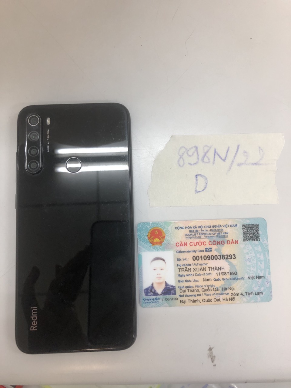 Ngày tiếp nhận: 04/10/2022 Mô tả: 01 túi ni lông có 1 điện thoại Redmi màu đen, 1 CCCD tên Trần Xuân Thành, 4 túi café và hạt điều. Vị trí: An ninh soi chiếu quốc nội |