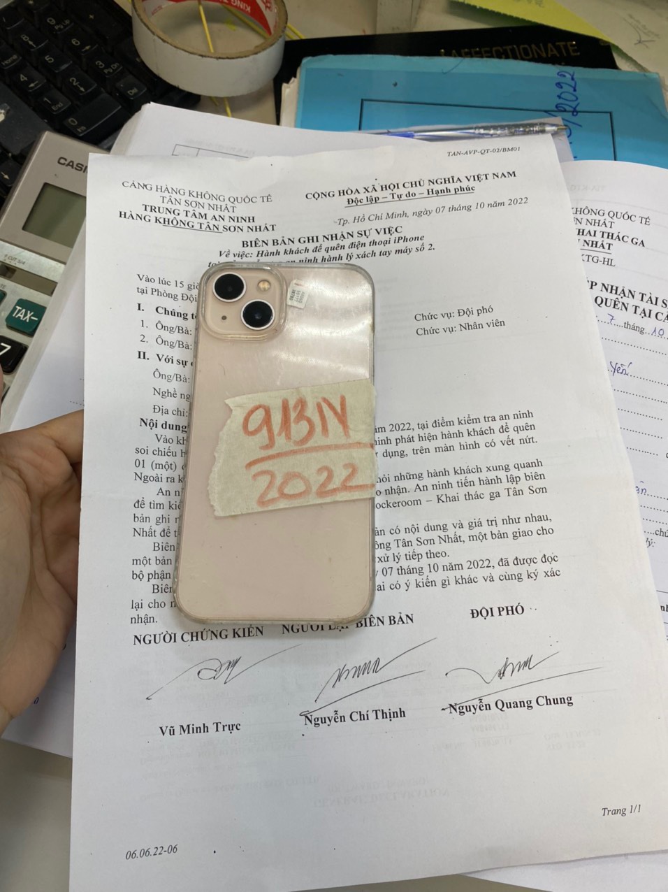 Ngày tiếp nhận: 07/10/2022 Mô tả: 01 điện thoại iPhone màu hồng đã sử dụng. Vị trí: An ninh soi chiếu quốc tế |