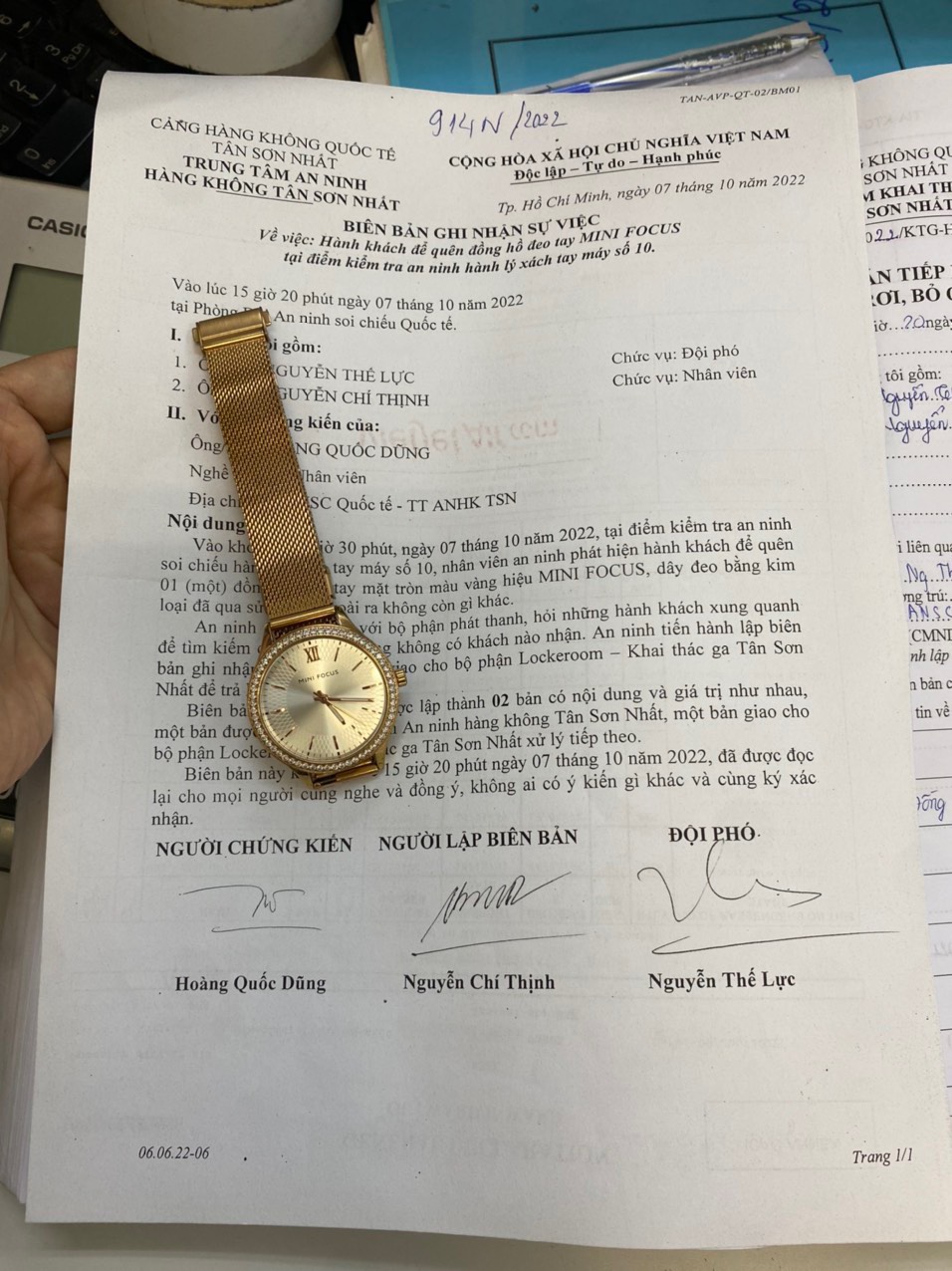 Ngày tiếp nhận: 07/10/2022 Mô tả: 01 đồng hồ đeo tay màu vàng hiệu Mini Focus đã sử dụng. Vị trí: An ninh soi chiếu quốc tế |