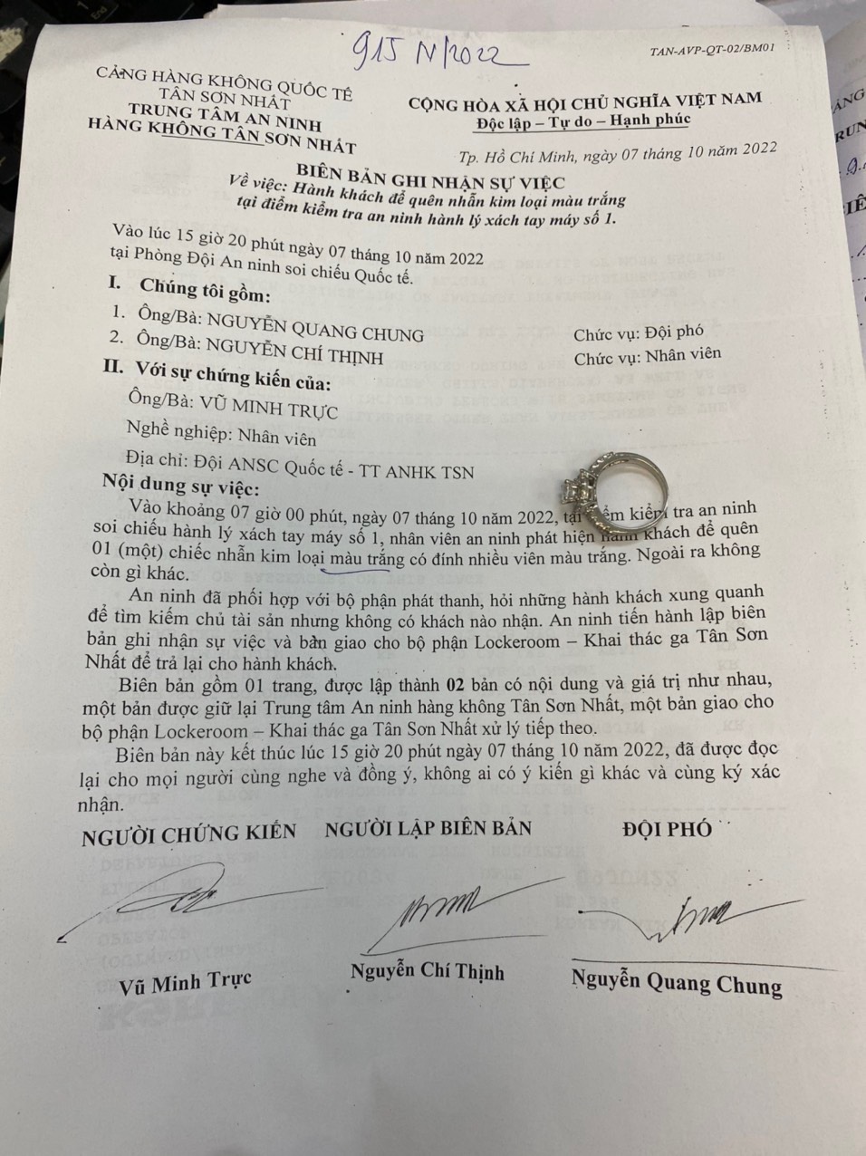 Ngày tiếp nhận: 07/10/2022 Mô tả: 01 chiếc nhẫn kim loại màu trắng có đính nhiều viên màu trắng. Vị trí: An ninh soi chiếu quốc tế |