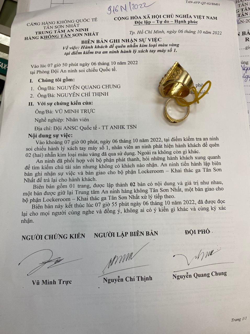 Ngày tiếp nhận: 07/10/2022 Mô tả: 02 chiếc nhẫn kim loại màu vàng. Vị trí: An ninh soi chiếu quốc tế |