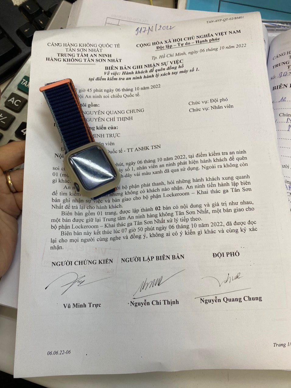 Ngày tiếp nhận: 07/10/2022 Mô tả: 01 đồng hồ Apple Watch dây vải màu xanh đã sử dụng. Vị trí: An ninh soi chiếu quốc tế |