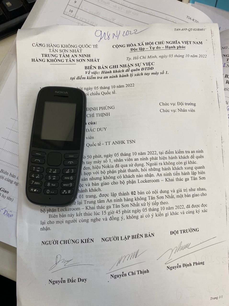 Ngày tiếp nhận: 07/10/2022 Mô tả: 01 điện thoại NOKIA màu đen đã sử dụng. Vị trí: An ninh soi chiếu quốc tế |