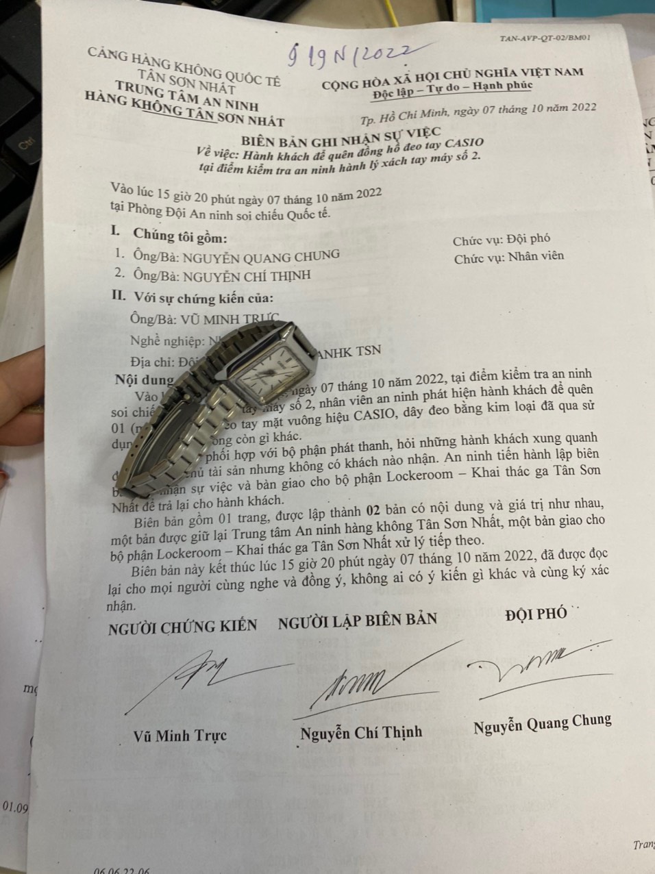 Ngày tiếp nhận: 07/10/2022 Mô tả: 01 đồng hồ đeo tay hiêu Casio đã sử dụng. Vị trí: An ninh soi chiếu quốc tế |