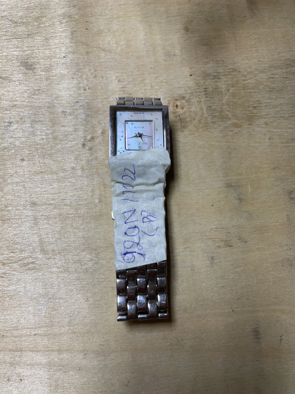 Ngày tiếp nhận: 07/10/2022 Mô tả: 01 đồng hồ dây kim loại màu trắng có chữ Christina đã sử dụng. Vị trí: An ninh soi chiếu quốc nội |