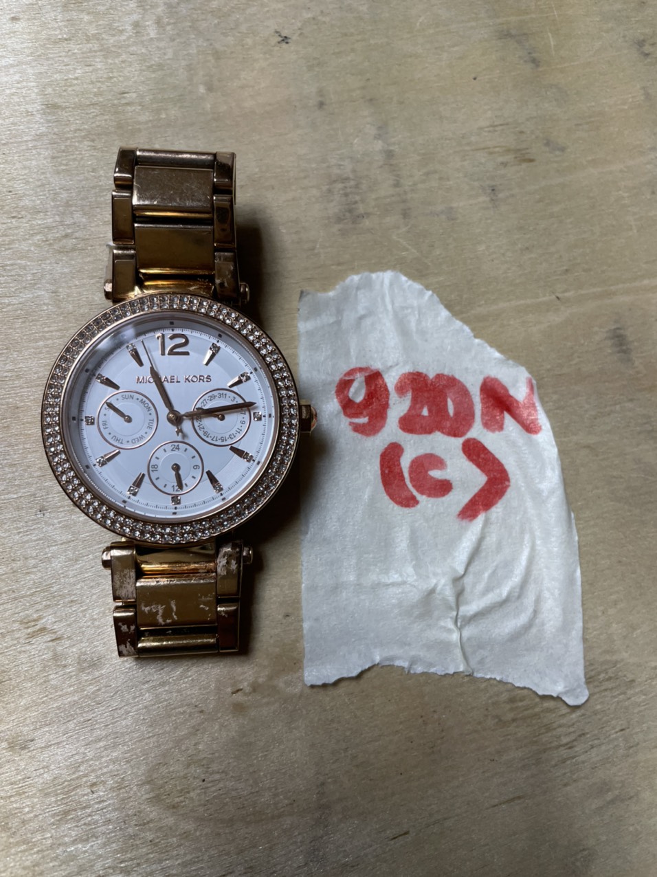 Ngày tiếp nhận: 07/10/2022 Mô tả: 01 đồng hồ dây kim loại màu vàng có chữ Micheal Kors đã sử dụng. Vị trí: An ninh soi chiếu quốc nội |