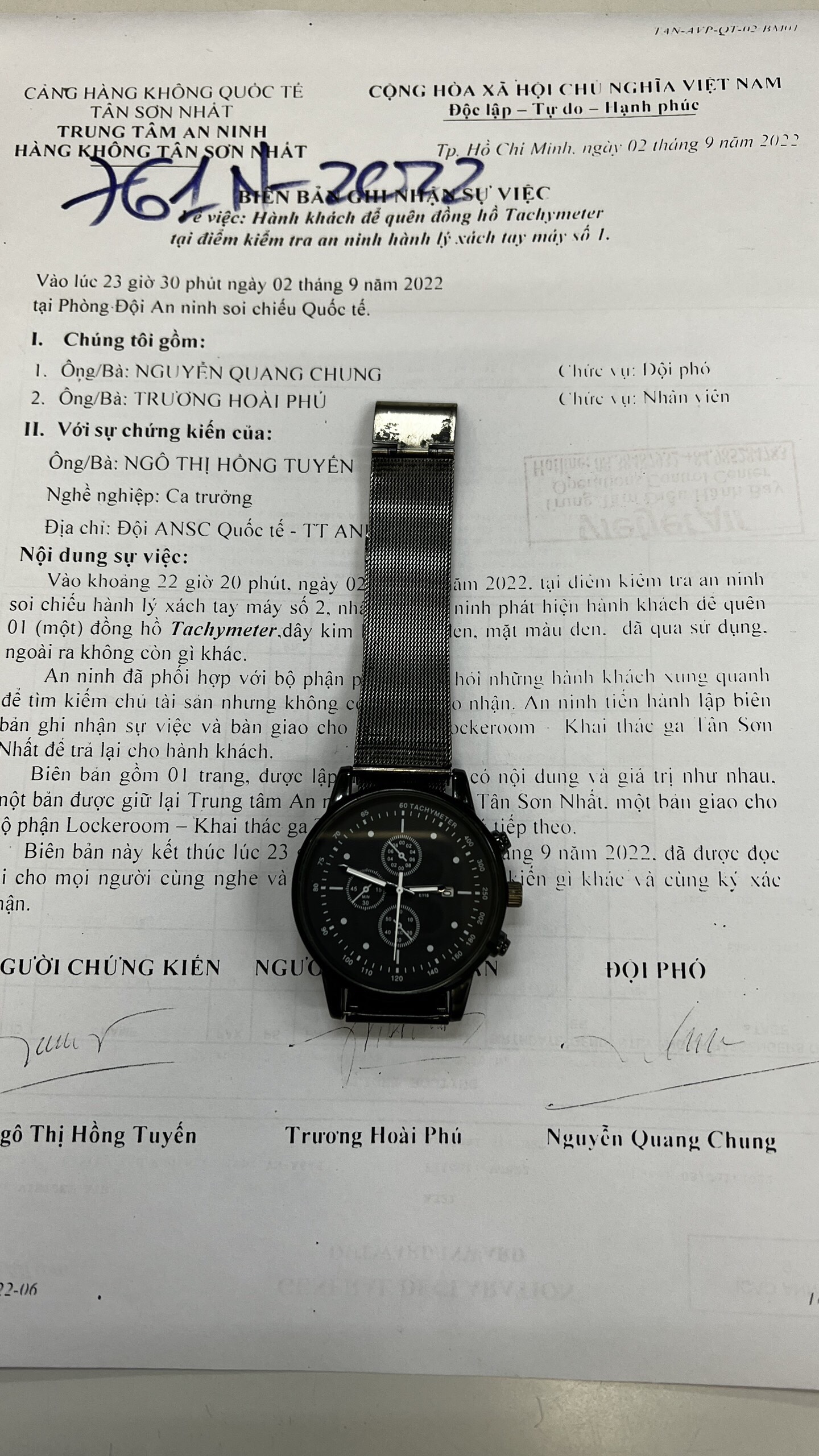 Ngày tiếp nhận: 07/9/2022 Mô tả: 01 đồng hồ điện tử xanh MI. Vị trí: An ninh soi chiếu quốc nội |