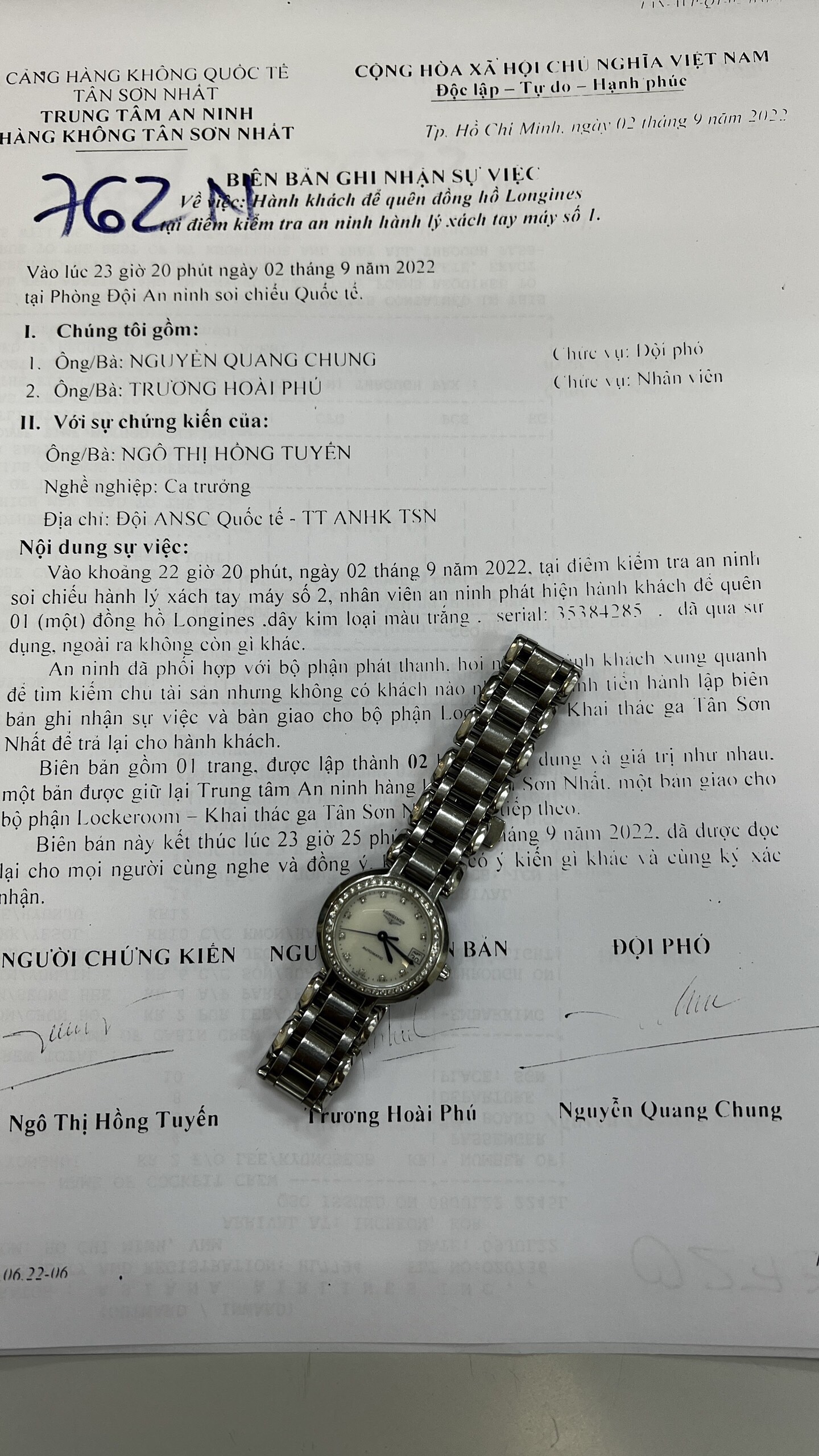 Ngày tiếp nhận: 06/9/2022 Mô tả: 01 đồng hồ Longines dây kim loại màu trắng. Vị trí: An ninh soi chiếu quốc tế |