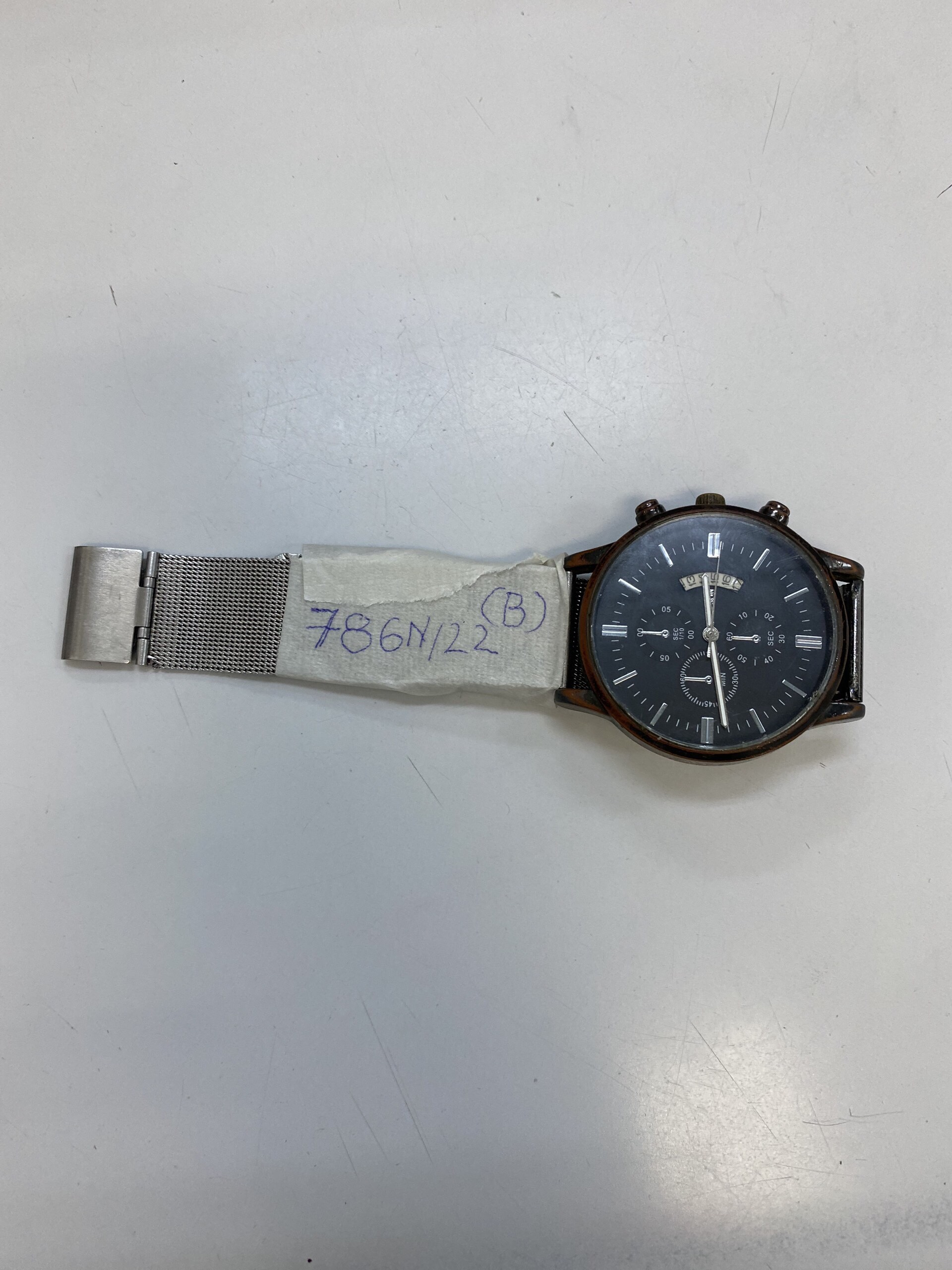 Ngày tiếp nhận: 06/9/2022 Mô tả: 01 đồng hồ dây kim loại đen Tachymeter. Vị trí: An ninh soi chiếu quốc tế |