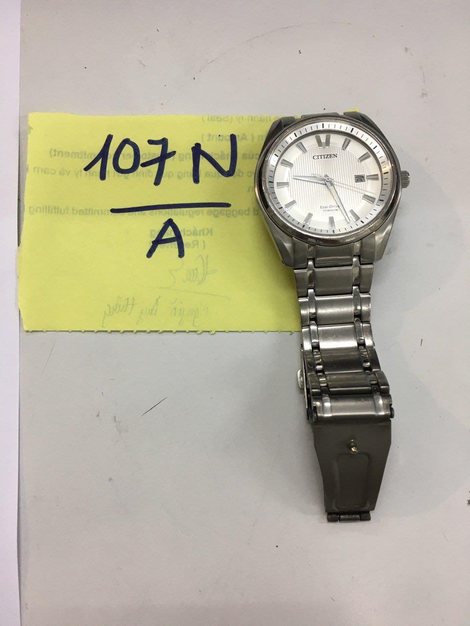 Mô tả: 01 Đồng hồ kim loại màu bạc, mặt màu đen "Citizen".
