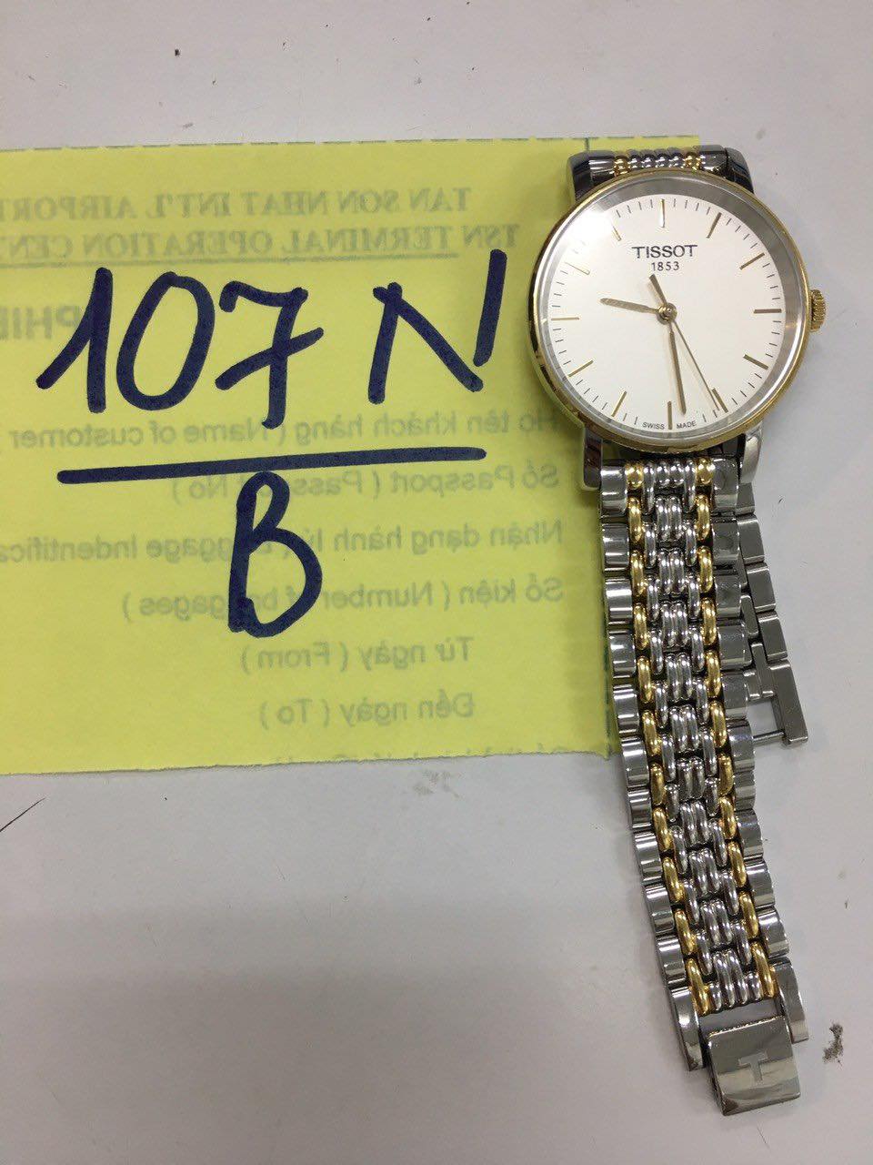 Mô tả: 01 Đồng hồ kim loại màu bạc, mặt màu vàng "Tissot".