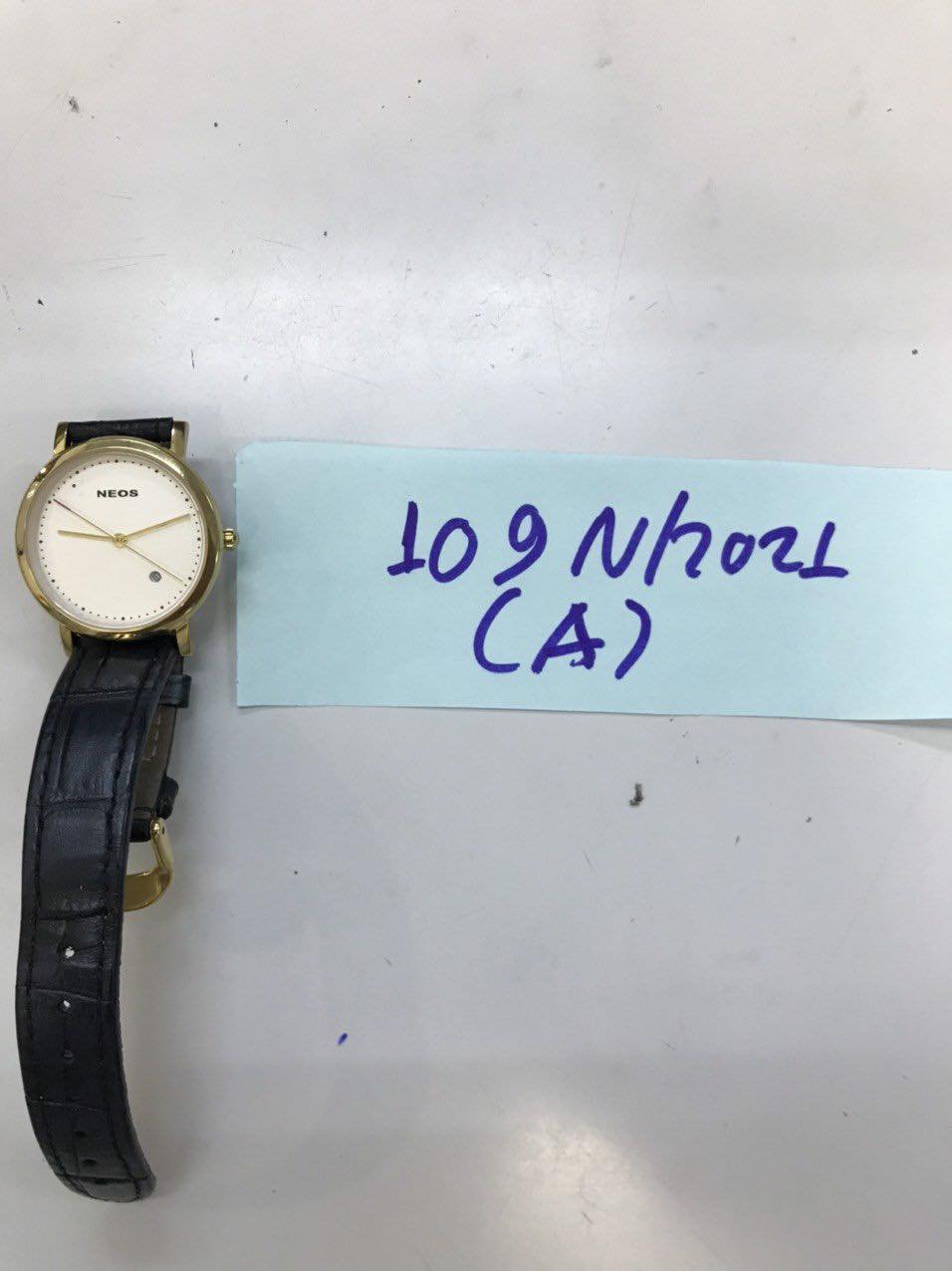 Đồng hồ dây da màu đen, mặt kim loại màu vàng "Neos".